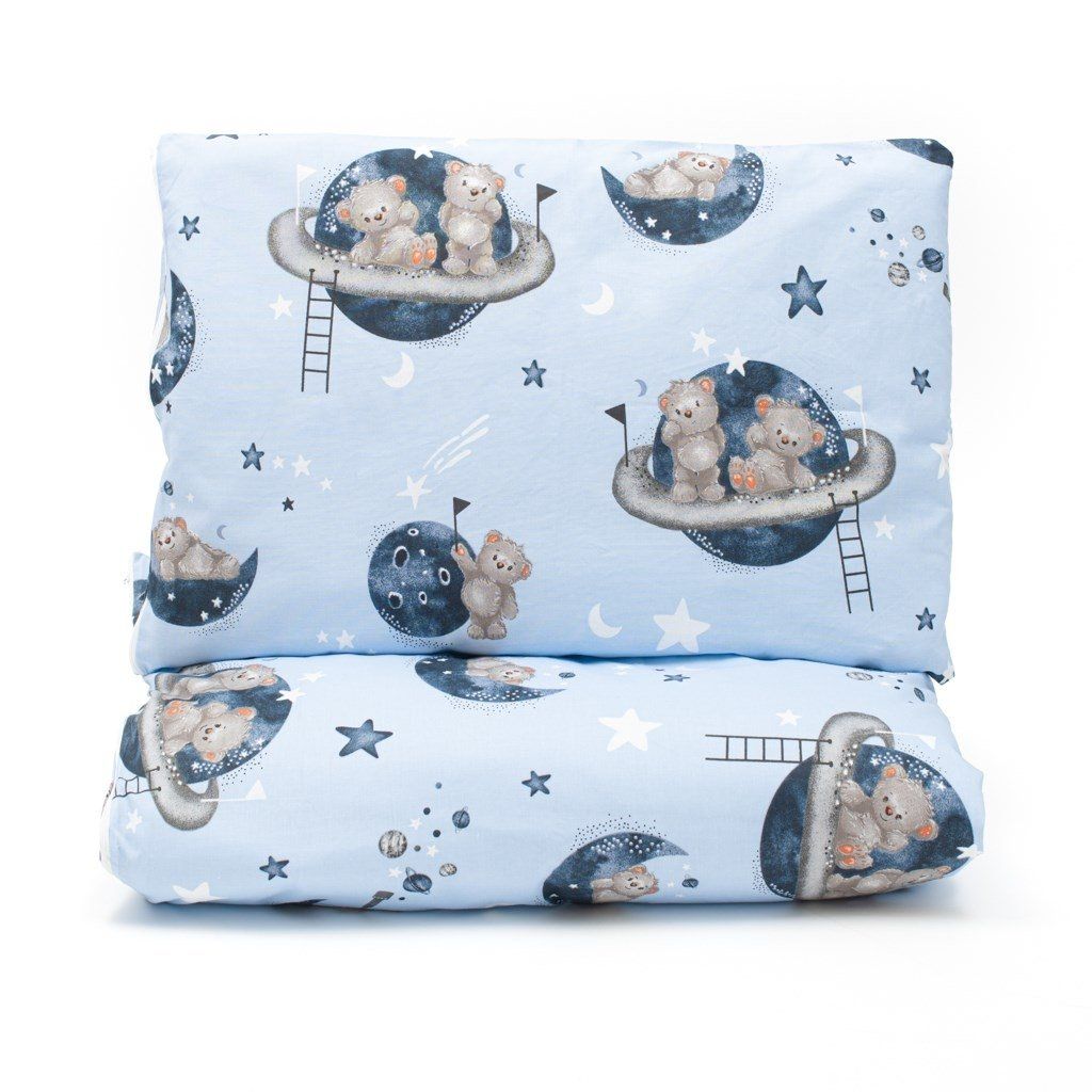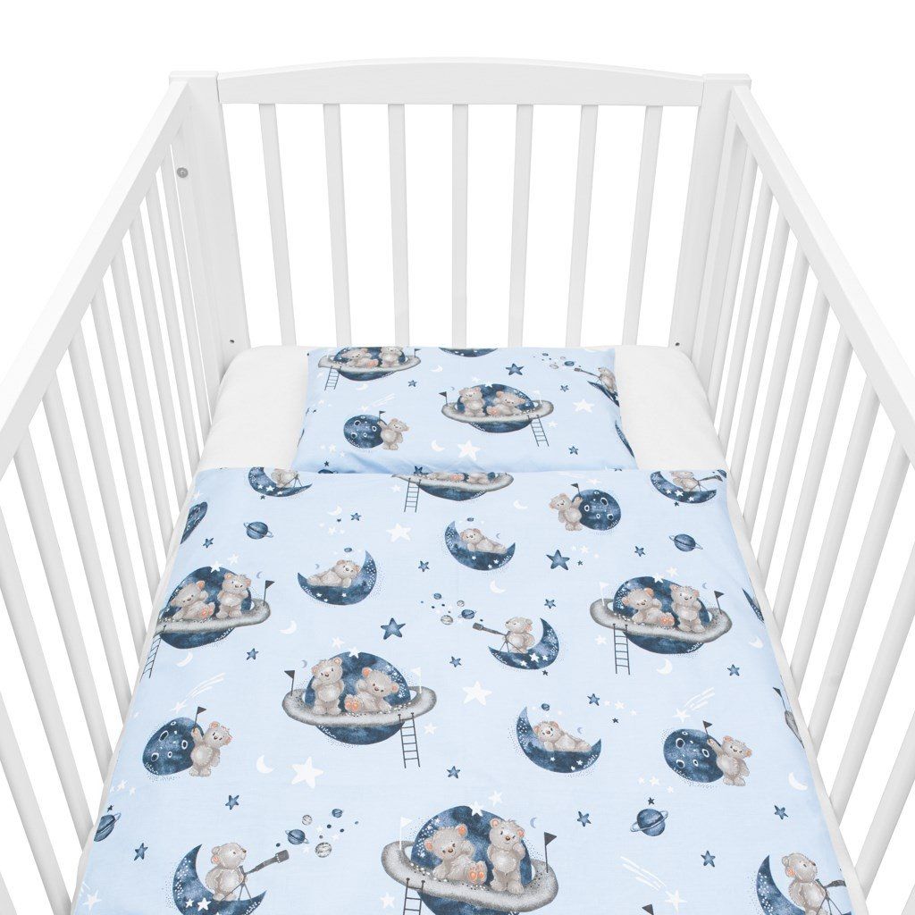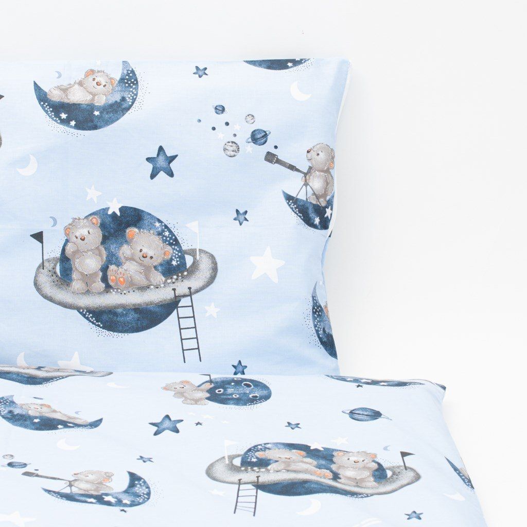 Detská 2-dielna súprava do postieľky New Baby Teddy bear in space. Súprava je vyrobená zo 100% bavlny. Kvalitné prevedenie a nádherný detský motív. Obsahuje obliečky na vankúšik cca 40x60 cm + obliečky na perinku cca 120x90 cm. Materiál 100% bavlna.Tieto výrobky sú bezpečné, pretože: