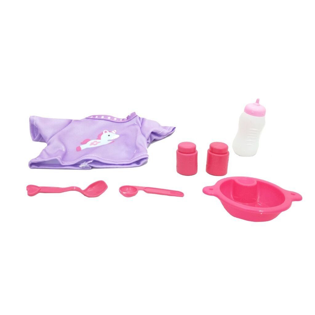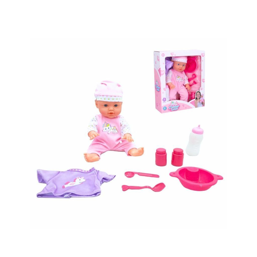 Roztomilé bábätko s doplnkami je ideálnou hračkou pre malé mamičky, ktoré sa rady starajú o svoje bábiky, balenie obsahuje bábätko v krásnom komplete s čiapočkou, fľaštičku, misku, lyžicu, vidličku, púder a krém, deti môžu bábätko kúpať, kŕmiť, obliekať a uspávať, čím rozvíjajú fantáziu, jemnú motoriku a sociálne zručnosti pri hre.Dodatočné parametre