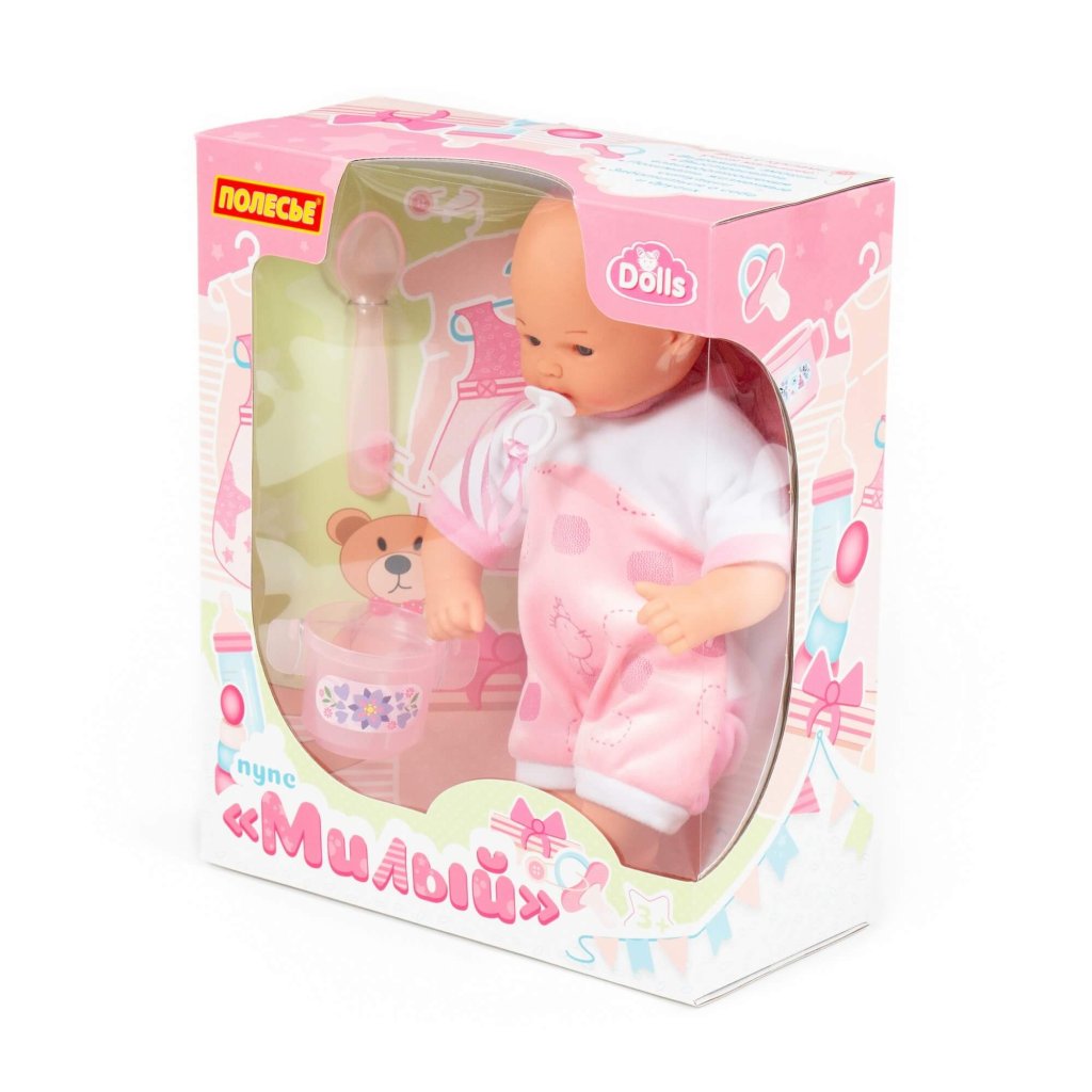 Hračka je vyrobená z kvalitných materiálov, má mäkko vypchaté telo, oči bábiky sa nezatvárajú. Sada obsahuje cumlík, ako aj sadu na kŕmenie - hrnček a lyžičku. Veľkosť bábätka je 28 cmDodatočné parametre