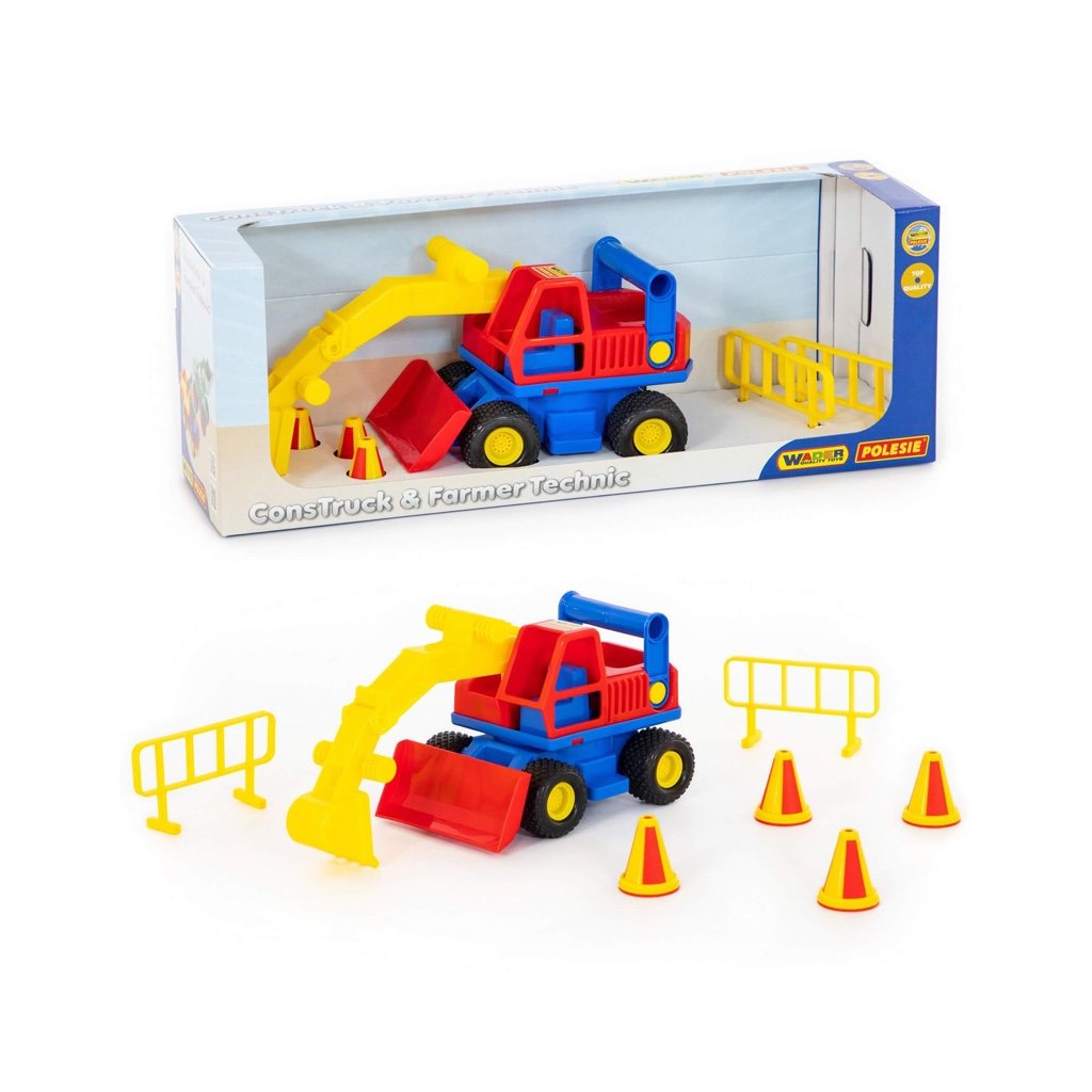 Bager ConsTruck s gumenými pneumatikami, všetky časti sú pohyblivé s možnosťou mechanickej manipulácie. Súčasťou balenia sú aj 4 kužele a 2ks cestné zábrany. Hračka je certifikovaná pre deti od 1 roku veku od renomovanej značky Wader quality toys. Farebné kombinácie konzultujte podľa aktuálneho stavu na sklade.Dodatočné parametre