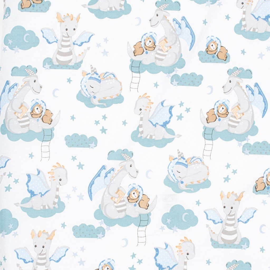 Bavlnené prestieradlo New Baby Dráčik je vyrobené z hladkej a na dotyk príjemnej bavlnenej látky-tkanina. Krásny detský motiv, polahodí detským očičkám. Všitá gumička zabraňuje skĺznutiu z matraca, zaručuje správne napnutie plachty a umožňuje prispôsobiť sa akémukoľvek tvaru. Prestieradlo je vhodné pre matrace s rozmermi 120x60 cm. Prestieradlo je klasické bavlnené, ktoré nie je elastické a preto má rozmery 90x150 cm, aby krásne sedelo na celom matraci aj zo spodnej strany.- hladká bavlnená tkanina