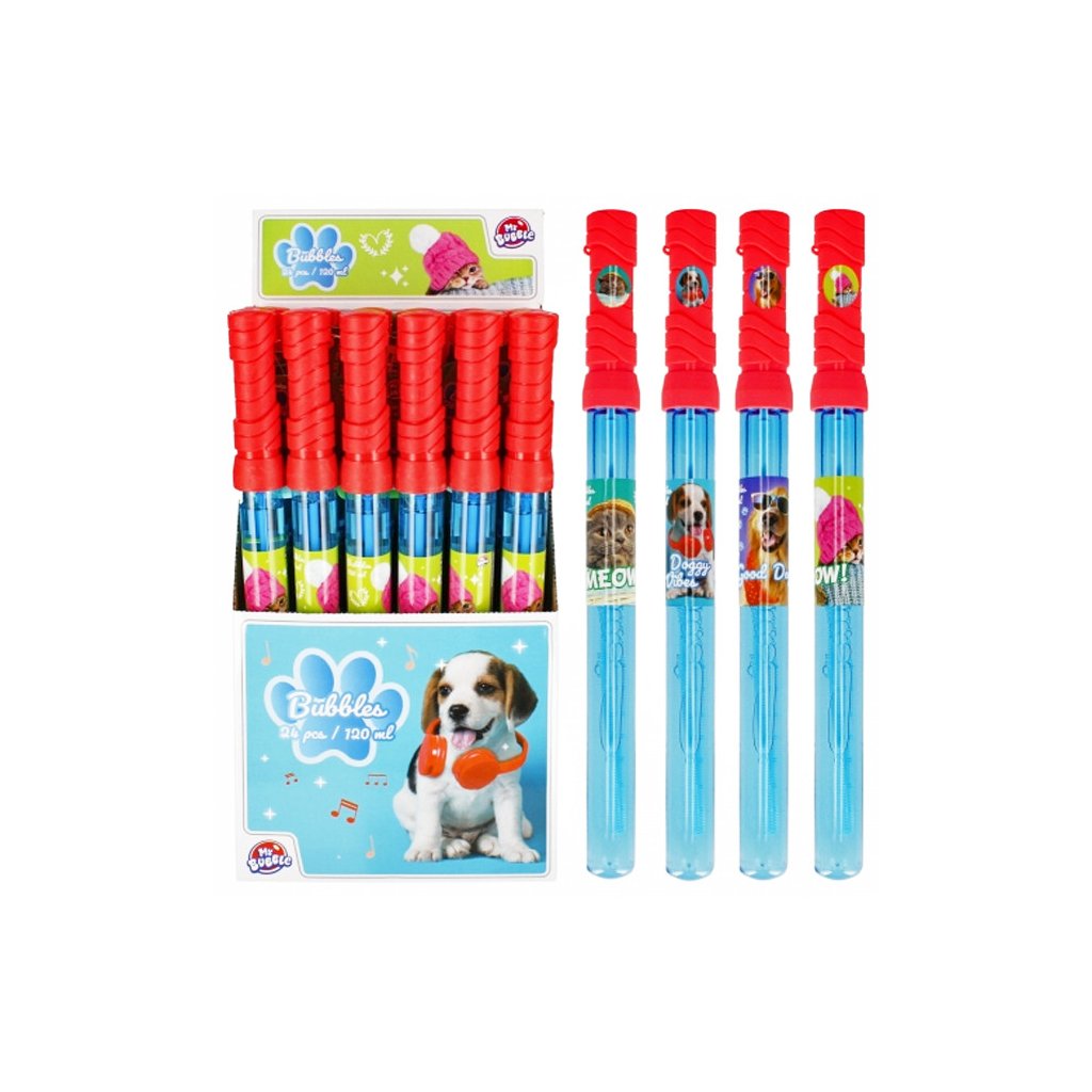 Bublifuk psík, má objem 120ml a dĺžku 37cm. Na výber zo štyroch variánt. Balené v boxe po 24 kusov. Cena je za 1 kus. Vhodné pre deti 3+.Dodatočné parametre