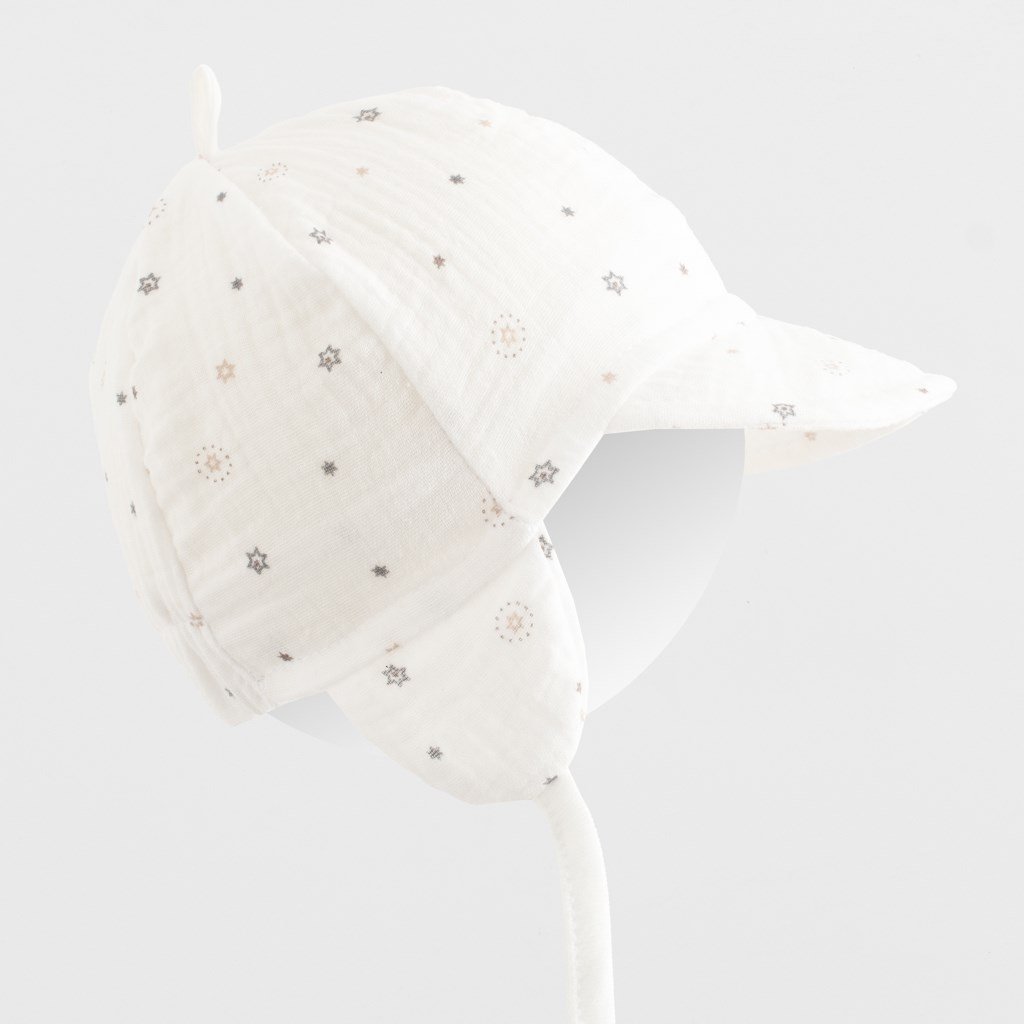 Letná mušelínová čiapočka so šiltom New Baby Arthur. Čiapočka ochráni hlavičku pred prudkým slnkom a vďaka šiltu, ktorý urobí tieň nespáli tváričku a chráni oči dieťaťa pred slnkom. Je krásne tvarovaná na ušká, zaväzuje sa na šnúrky, netlačí a bude dobre držať na hlavičke bábätka. Mušelín je jedna z najčistejších, najjednoduchších a najjemnejších tkanín na svete. Jemne tkaný priedušný materiál je tak dokonalý, že si ho zamilujú deti po celom svete. Ľahká štruktúra umožňuje mušelínu dýchať a zaisťuje dostatočnú cirkuláciu vzduchu, čím znižuje riziko prehriatia. Táto vlastnosť pomáha udržať Vaše dieťa v pohodlí, bezpečí a rodičov v pokoji. Mušelín je veľmi odolný a to tak, že bez problémov zvláda opakované pranie a postupom času je ľahší a jemnejší. Zloženie: 100% bavlna. OEKO-TEX STANDARD 100.Dodatočné parametre
