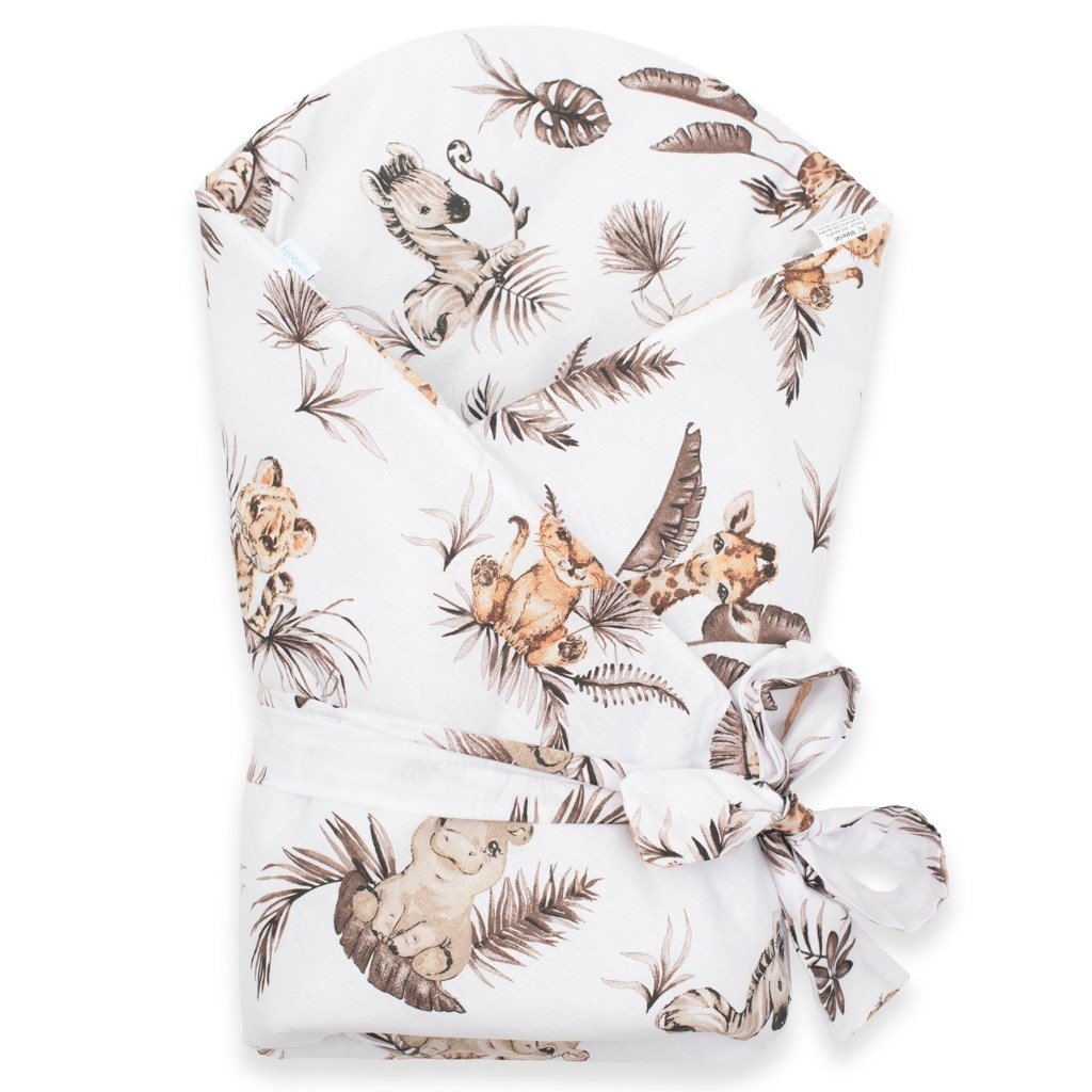 Nádherná detská zavinovačka New Baby Safari pre bábätká. Zavinovačka je vyrobená z kvalitného a jemného materiálu, ktorý zaručí vášmu bábätku príjemné teplo. Výplň je až 3 cm čo znamená, že zavinovačka je vhodná aj na chladnejšie dni a je dostatočne pevná. Krásny detský motív, polahodí detským očičkám. Zapínanie na suchý zips aj stuhu na zaviazanie na mašľu.Rozmery cca 80x80cm.