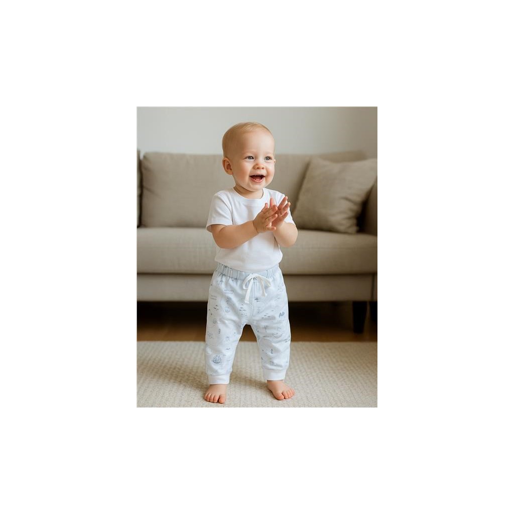 Dojčenské nohavice sú celopotlačené nápaditým detským motívom. Pre jednoduché obliekanie majú v páse gumičku, ktorá netlačí a všitý ozdobný pásik na zaväzovanie. Na nohaviciach v spodnej časti sú našité širšie lemy.