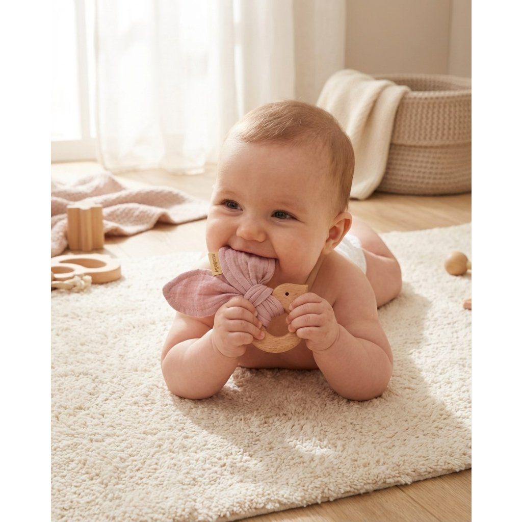 Hryzátko s mušelínovou plienkou je ideálna súprava, keď sa dieťaťu prerezávajú zúbky. Hryzátko je vyrobené z bukového dreva šetrného k životnému prostrediu a mäkkej mušelínovej tkaniny. Je úplne bezpečná pre bábätká a prináša upokojujúcu úľavu pri prerezávaní zúbkov. Hryzátko možno použiť aj ako hračku pre bábätká. Hryzátko sa dokonale hodí k našim ostatným mušelínovým výrobkom a vytvára krásnu súpravu, ktorú môžete darovať ako darček na oslavu narodenia dieťaťa.