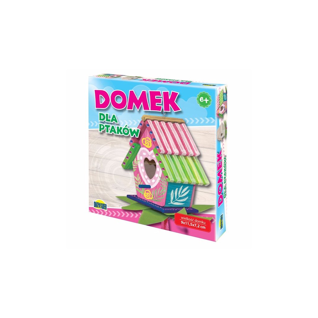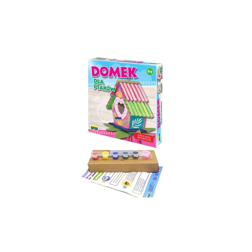 Domček pre vtáčiky. V balení nájdete drevené časti domčeka, 5 farbičiek, 2 štetce, lepidlo, dekoračné kamienky, gorálky, 4 listy z látky, 30 cm stuha, 2 háčiky a návod. Veselú tvorivú zábavu.Dodatočné parametre