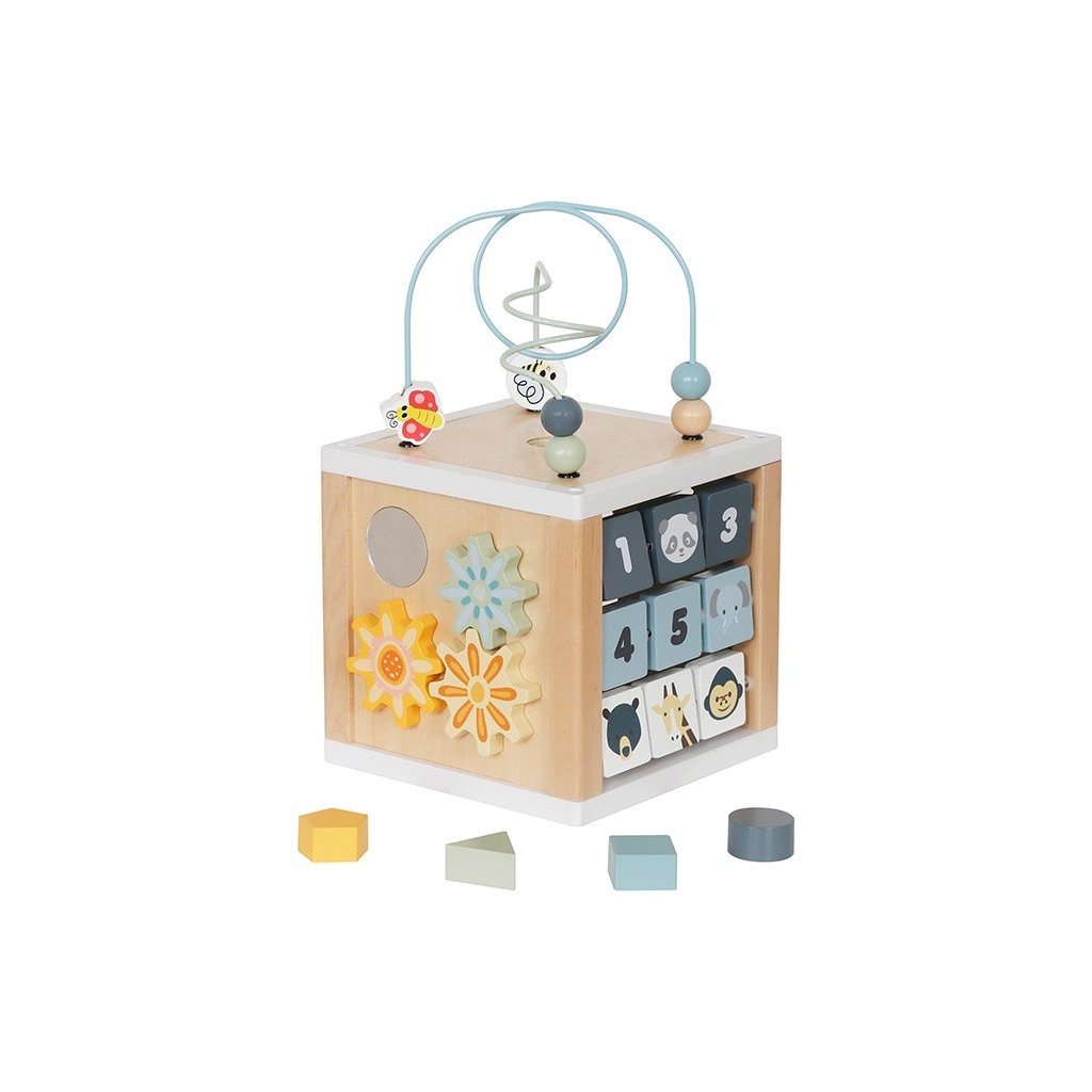 Päť rôznych motorických aktivít v jednej hračke – bludisko s korálikmi, tvary na nasadzovanie, ozubené kolesá, zábavné kocky so zvieratkami, zrkadlo a posuvné prvky.