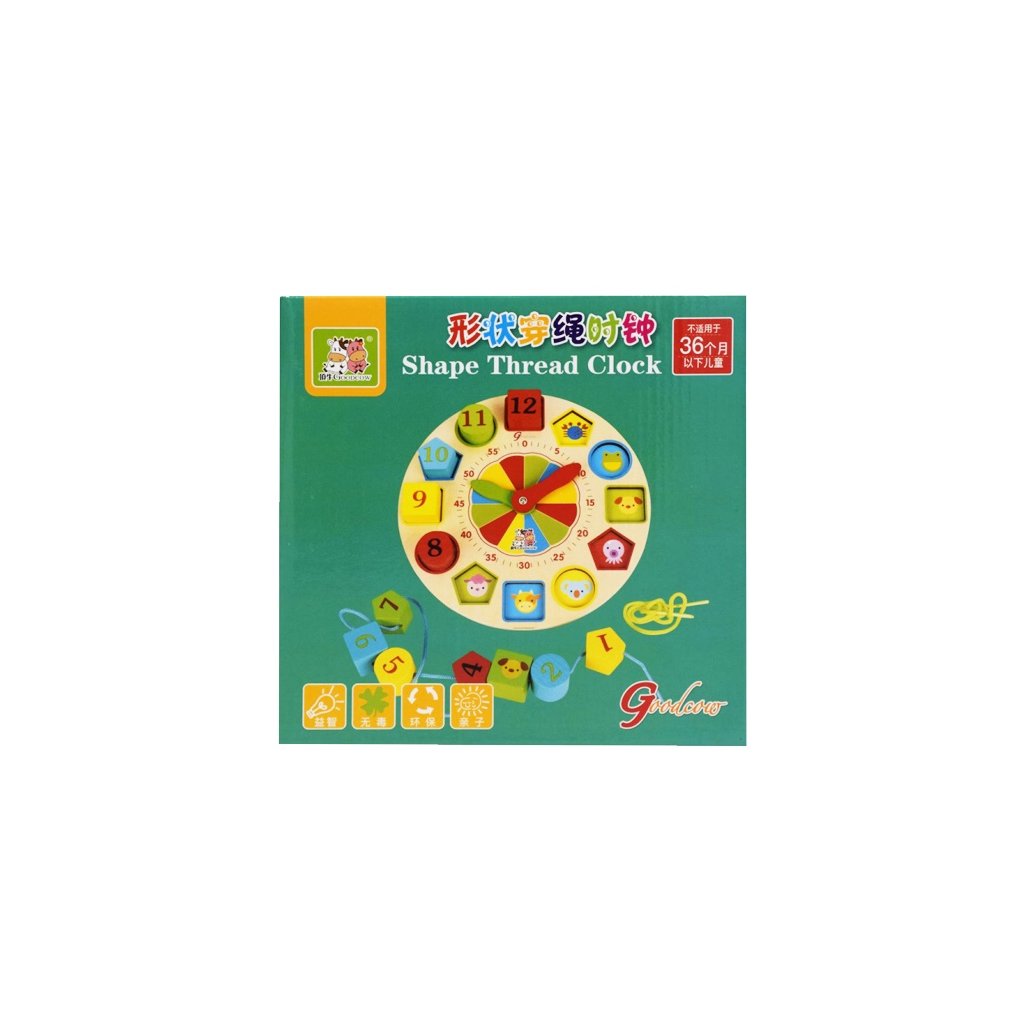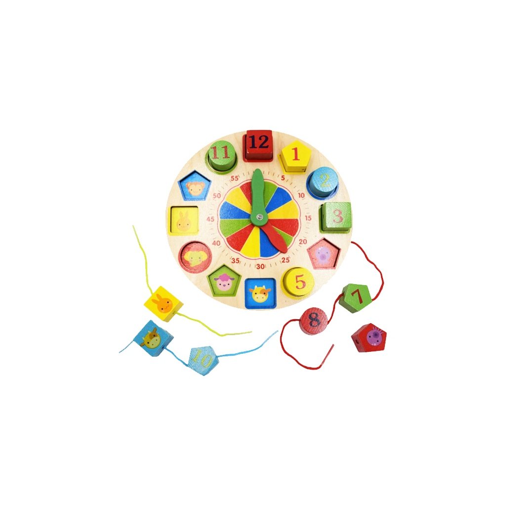 Hravý spôsob ako sa naučiť hodiny. Pod každým tvarom na teba pozerá zvieratko, ktoré slúži ako nápoveda pre vkladačku. Jednotlivé tvary si možeš navliekať na farebnú šnúrku. Balenie obsahuje hodiny, vkladacie a navliekacie kocky a farebné šnúrky. Nevhodné pre deti do 3 rokov. Priemer - 21,5 cmDodatočné parametre