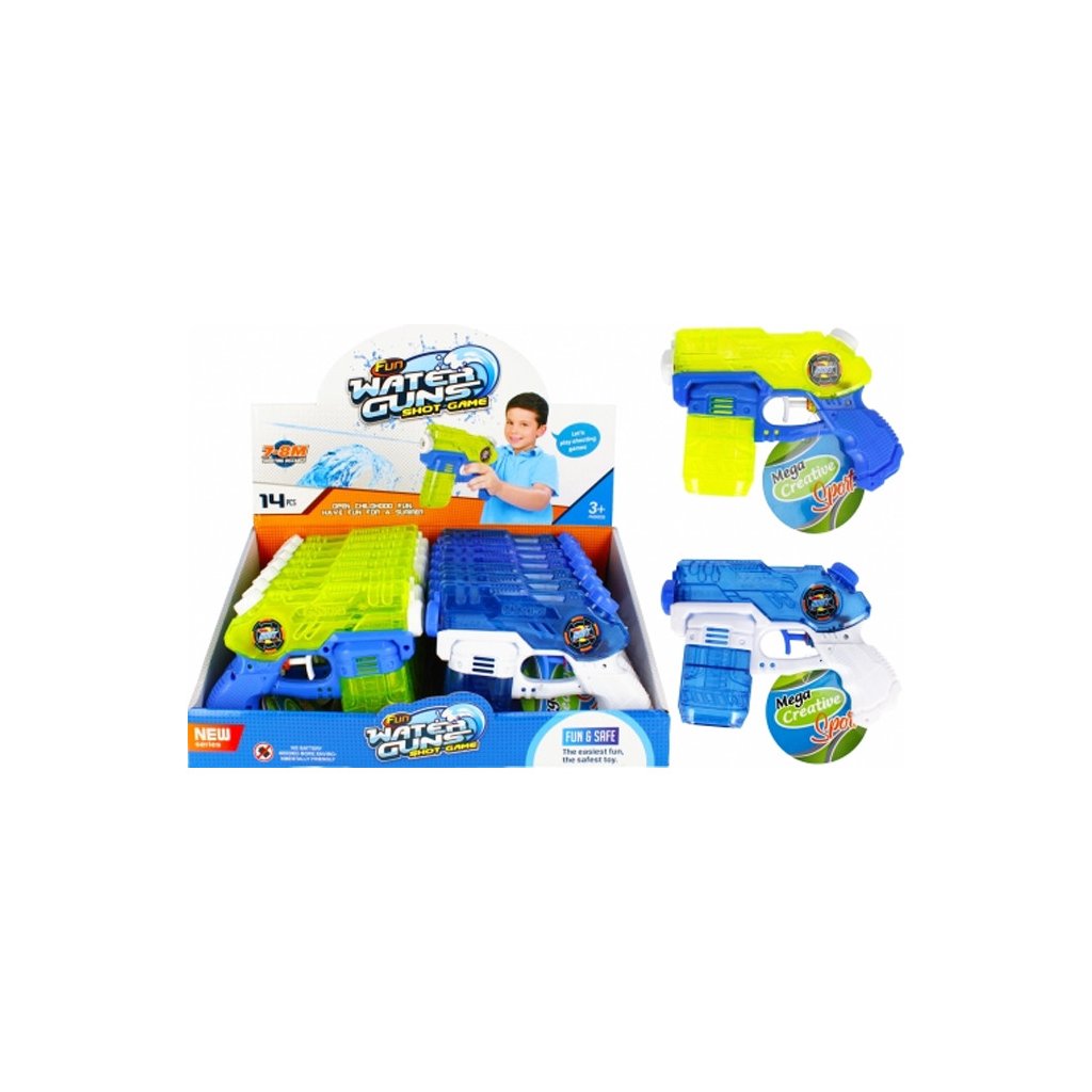 Farebná vodná pištoľ, na výber z dvoch variánt. Rozmery produktu sú 17 x 12 x 4 cm. Balené po 14 kusoch. Cena je za 1 kus. Produkt je určený pre deti vo veku 3+.Dodatočné parametre