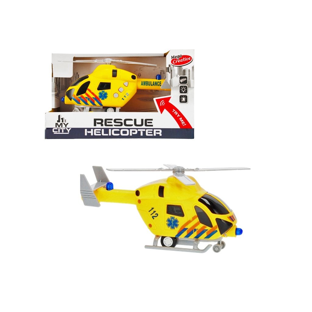 Má zvukové a svetelné efekty, má pohyblivé časti. Helikoptéra má svetelné a zvukové efekty: zvuky motora a stúpanie do vzduchu. Obsah sady: Sanitkový vrtuľník. Hračka vyrobená z plastu. Rozmery výrobku [cm]: 20 x 9 x 6 / vrtuľa 16,5 x 16,5 rozmery balenia [cm]: 22,5 x 13, 5x10 ,vyžaduje napájanie z batérie 3 x AG13- Nie je súčasťou. Hračka je určená pre deti vo veku 3+. Balené v krabici s oknom.Dodatočné parametre