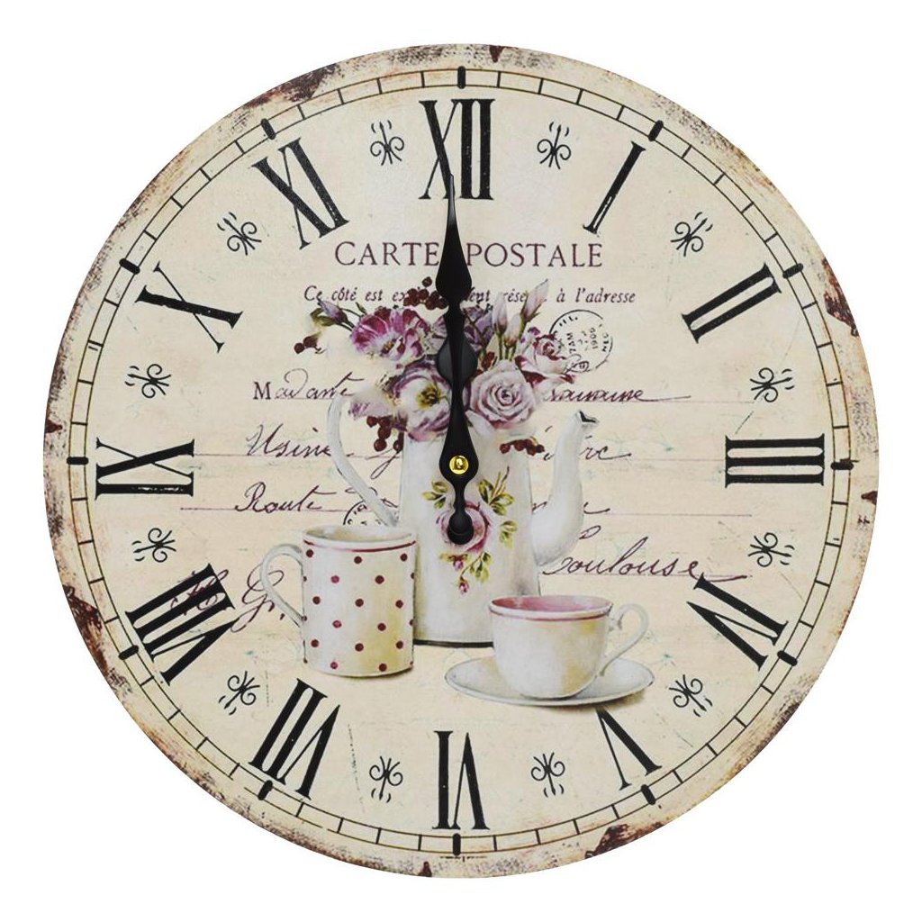 Cena za 1 ks: 7.55, HODINY NÁSTENNÉ MDF DIA 34CM ČAJNÍK S KVETMI
