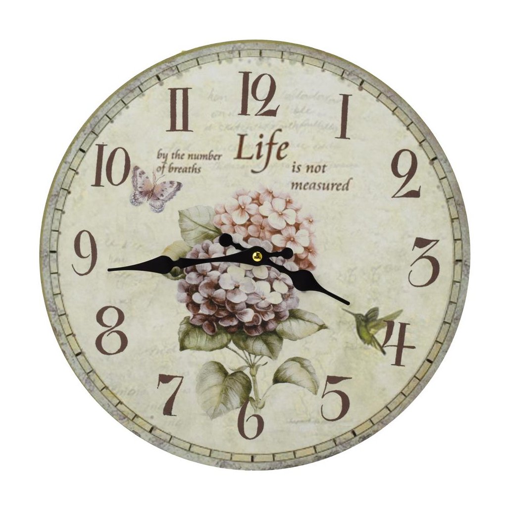 Cena za 1 ks: 7.55, HODINY NÁSTENNÉ MDF DIA 34CM HORTENZIA