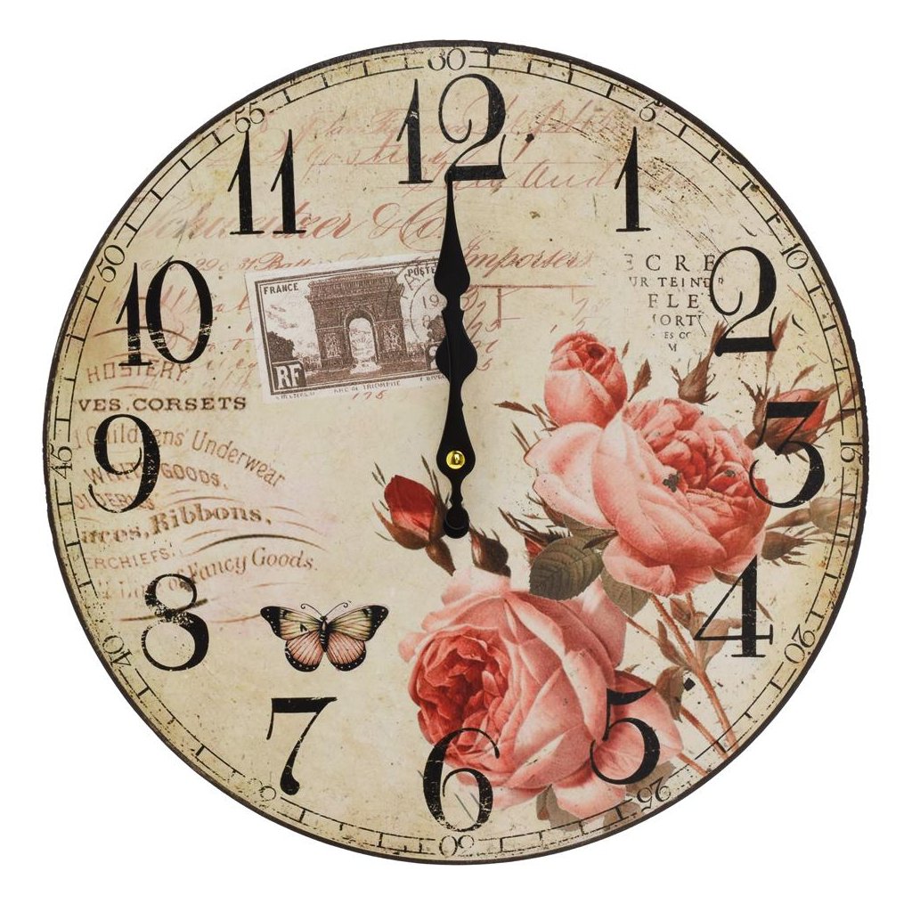 Cena za 1 ks: 7.55, HODINY NÁSTENNÉ MDF DIA 34CM RUŽE S MOTÝĽOM