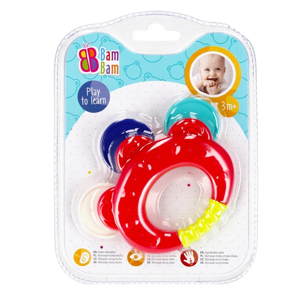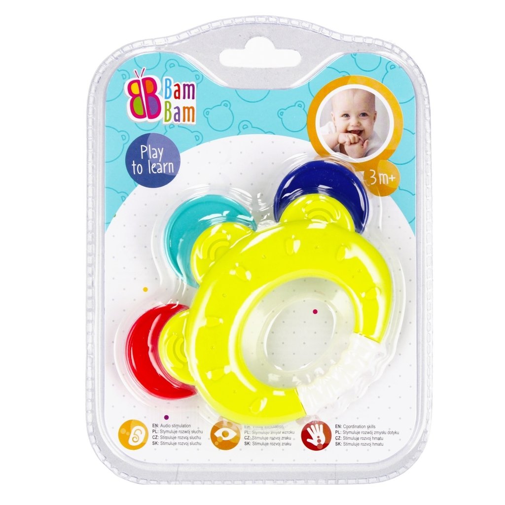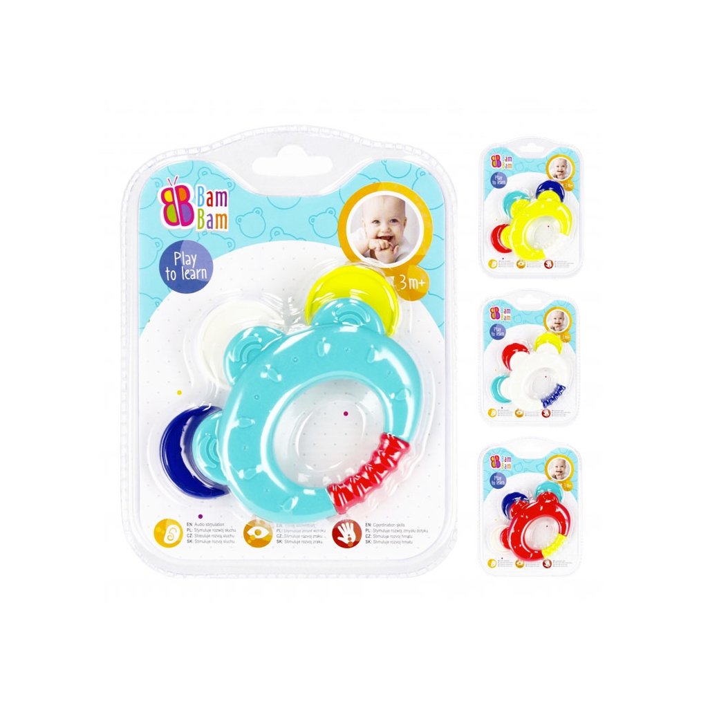CHRASTÍTKO ideálne pre fázu prerezávania zúbkov, kedy sú ďasná opuchnuté. Vyrobené z kvalitného plastu prináša úľavu a upokojuje ďasná bábätka v tomto náročnom období. Tvar hrkálky bol navrhnutý tak, aby jeho uchopenie a držanie v malých ručičkách bolo jednoduché a praktické. Rôznorodá štruktúra a nerovný povrch hračky umocňujú hmatové vnemy a rozvíjajú manuálne zručnosti. Široká škála farieb stimuluje zrakové vnímanie. Hračka je určená od veku 3 m+.Dodatočné parametre