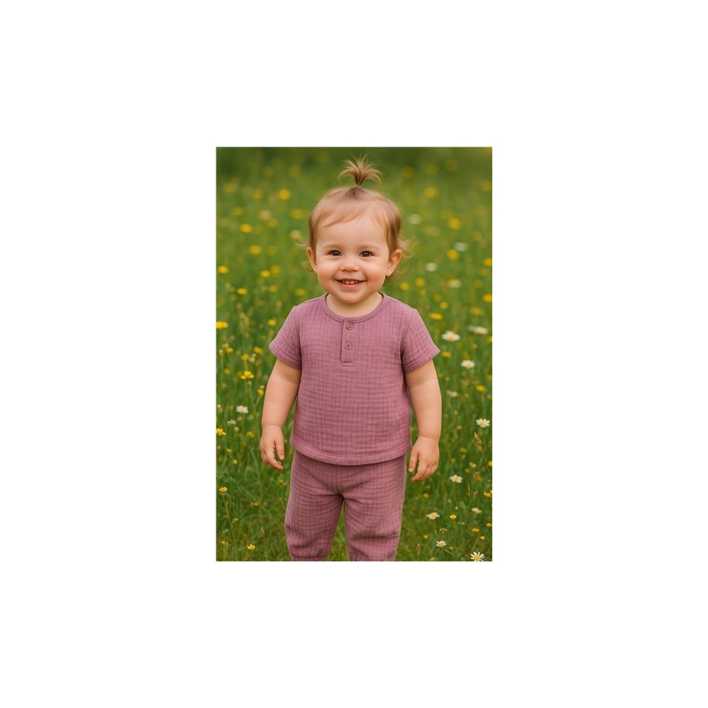 Štýlová a praktická 2-dielna detská súprava New Baby. Mušelínová súpravička sa skladá z trička s krátkym rukávom a nohavíc. Veľmi praktický set pre deti v jarných aj letných dňoch. Mušelínové tričko je veľmi pohodlné už len tým, že je vyrobené z kvalitnej a priedušnej mušelínovej bavlny so zapínaním na cvočky pod krčkom. Mušelínové nohavice s moderným strihom majú praktický strih, v páse a na nohavičkách je gumička, ktorá netlačí.