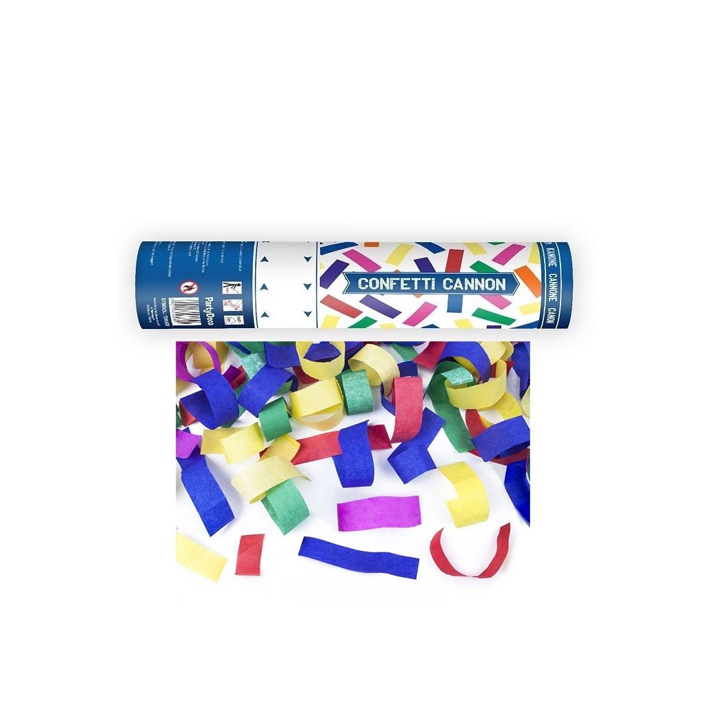 Konfety 20 cm, farebné papierové prúžky. Konfety sú uložené vo valcovitej tube. Držia sa v ruke a ovládajú sa mechanickým pootočením tubusu. Po vystrelení vyletia farebné papierové prúžky do výšky 5 až 8 metrov a rozptýlia sa do okolia. Iniciácia stlačený vzduch. Tubus kov. Manipulácia pootočenie. Max dĺžka odpálenia 8 m. Bezpečnosť konfety je možné použiť vo vonkajších aj vnútorných priestoroch. Bezpečná vzdialenosť prizerajúcich divákov od tuby konfiet je 10 metrov.Dodatočné parametre