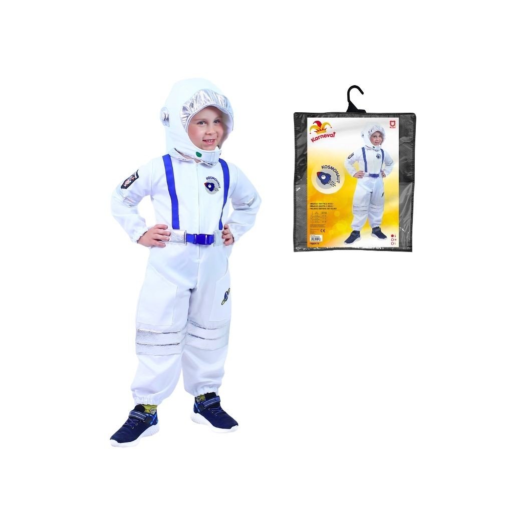 Senzačný karnevalový kostým astronauta. Kostým vo veľkosti S je určený pre chlapčekov vo vekovom rozmedzí 4-6 rokov 105-116 cm. Balenie obsahuje bielu kombinézu so striebornými doplnkami a látkovú helmu.Dodatočné parametre