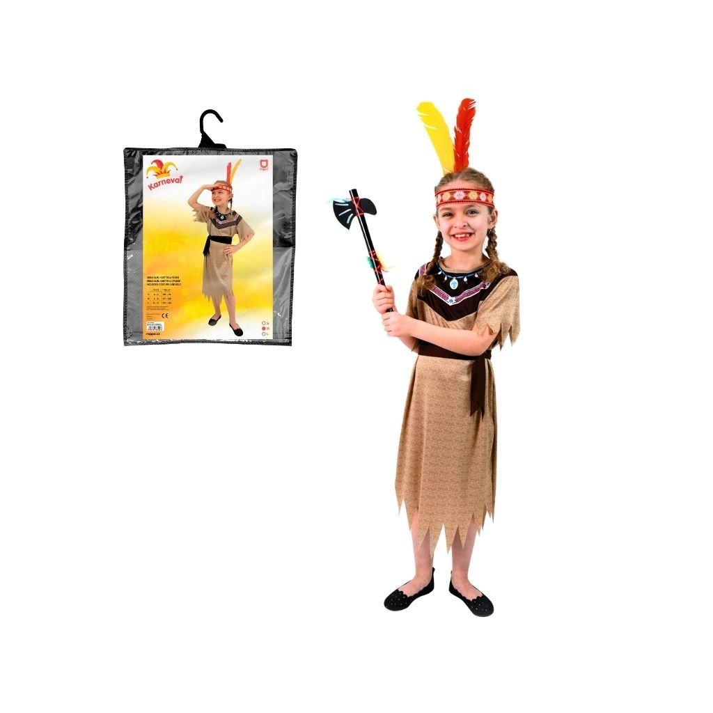Štýlový karnevalový kostým v motíve indiánskej slečny! Kostým hnedej farby vo veľkosti M je určený pre dievčatá vo vekovom rozmedzí 6-8 rokov 117-128cm. Staň sa najväčšou hviezdou karnevalu! Sekera ani čelenka nie sú súčasťou balenia.Dodatočné parametre