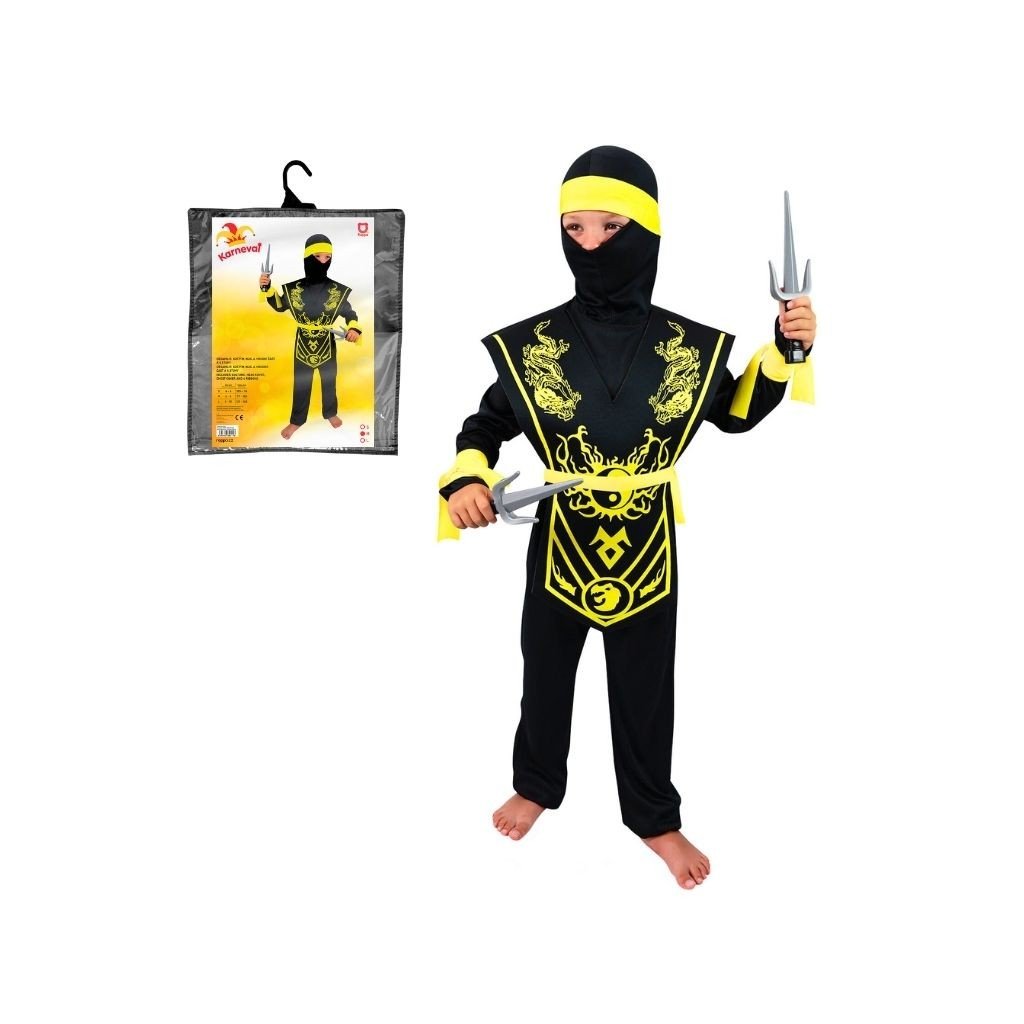 Karnevalový kostým Ninja vo veľkosti M je určený pre chlapcov vo vekovom rozmedzí 6-8 rokov 116-128 cm. Balenie obsahuje overál, vestu zdobenú žltými bojovými motívmi, kuklu, čelenku, opasok a pásky na ruku.Dodatočné parametre