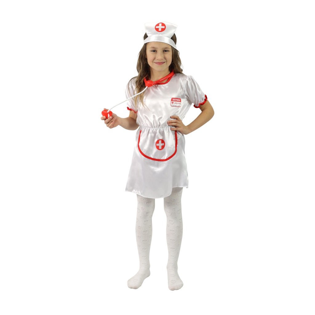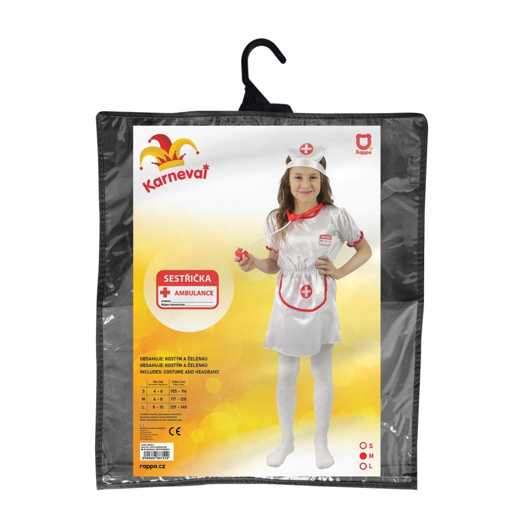 Krásny karnevalový kostým pre malé zdravotné sestričky. Kostým veľkosti M je určený pre dievčatá vo vekovom rozmedzí 6-8 rokov 117-128 cm. Sada obsahuje šaty a čiapku. Stetoskop nie je súčasťou balenia.Dodatočné parametre