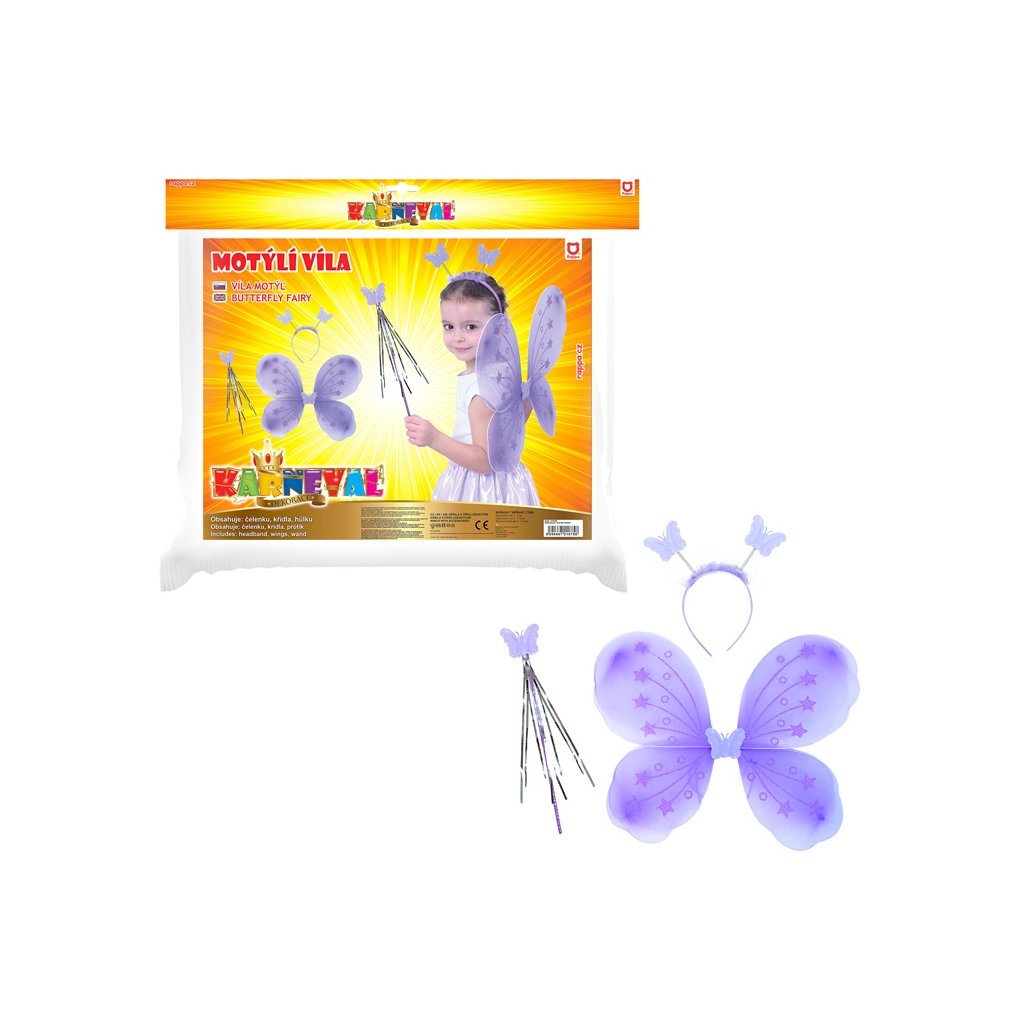 Roztomilé fialové motýlie krídelká na gumičku sú určené pre dievčatká vo vekovom rozmedzí 3-10 rokov 104-150 cm. Súčasťou tejto karnevalovej sady je tiež čelenka s motýlikmi na pružinkách a palička. Rozmery balenia sú 46×44×1 cm. Určené pre deti vo veku 3+.Dodatočné parametre