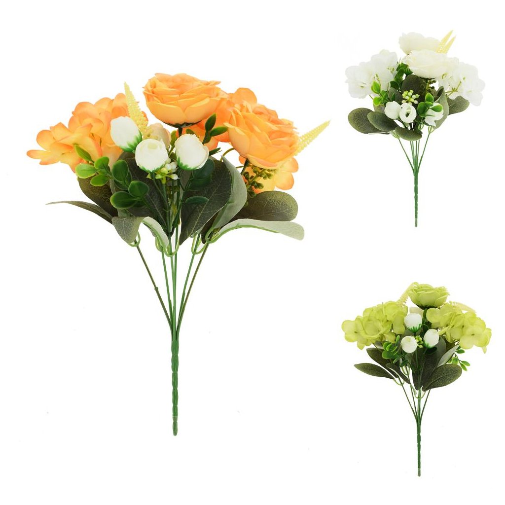 Cena za 1 ks: 1.53, KYTICA RUŽA,HYDRANGEA, DROB.KVETY,ZELEŇ MIX/3F 32CMDodatočné parametre