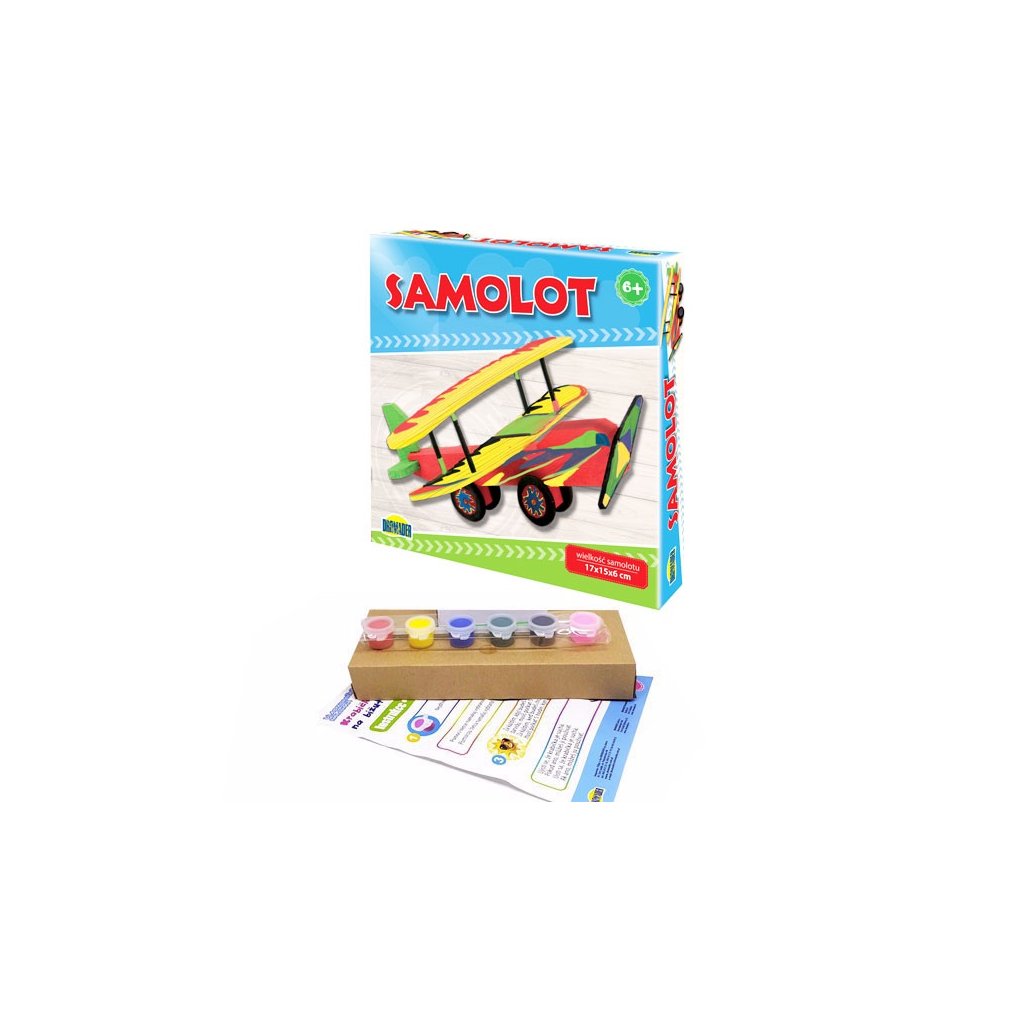 Lietadlo - urob a pomaľuj. V balení nájdete drevené časti loďky, 5 farbičiek, 2 štetce, lepidlo, dekoračné drobnosti a návod. Veselú tvorivú zábavu.Dodatočné parametre