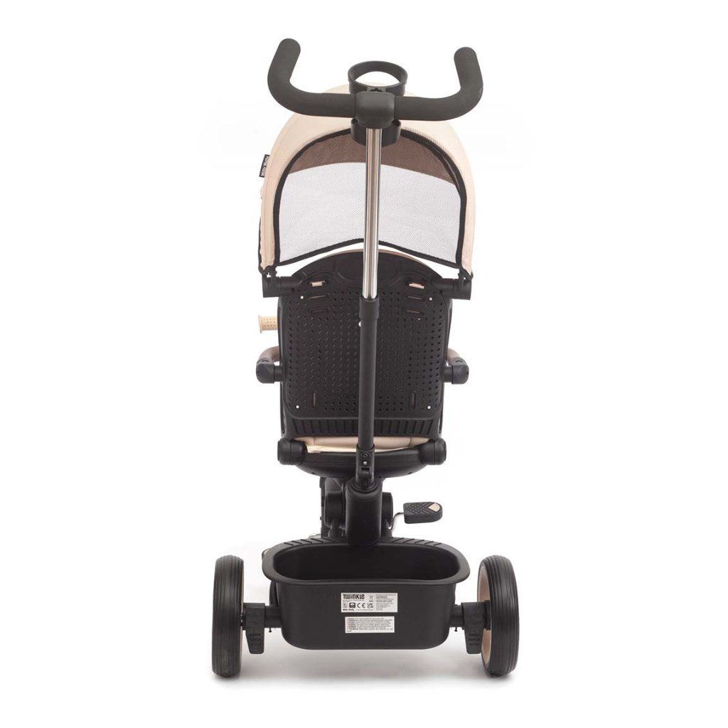 Twinkle je vybavená nastaviteľnou rukoväťou, funkciou voľnobehu, brzdou, bezpečnostnými pásmi s chráničmi a pohodlným trojpolohovým operadlom a zaručuje úplnú kontrolu a pohodlie pre dieťa aj rodičov. Jej ľahký, ale odolný oceľový rám, kolesá s penovou výplňou a guličkovými ložiskami, skladacia konštrukcia a praktické prvky, ako je sieťovaná strieška, LED svetlo, držiak na nápoje a dva úložné boxy, z nej robí perfektnú voľbu pre každú príležitosť - v meste, na prechádzke alebo na výlete. Po odstránení rukoväte, koľajníc a striešky je možné Twinkle používať ako klasickú trojkolku.