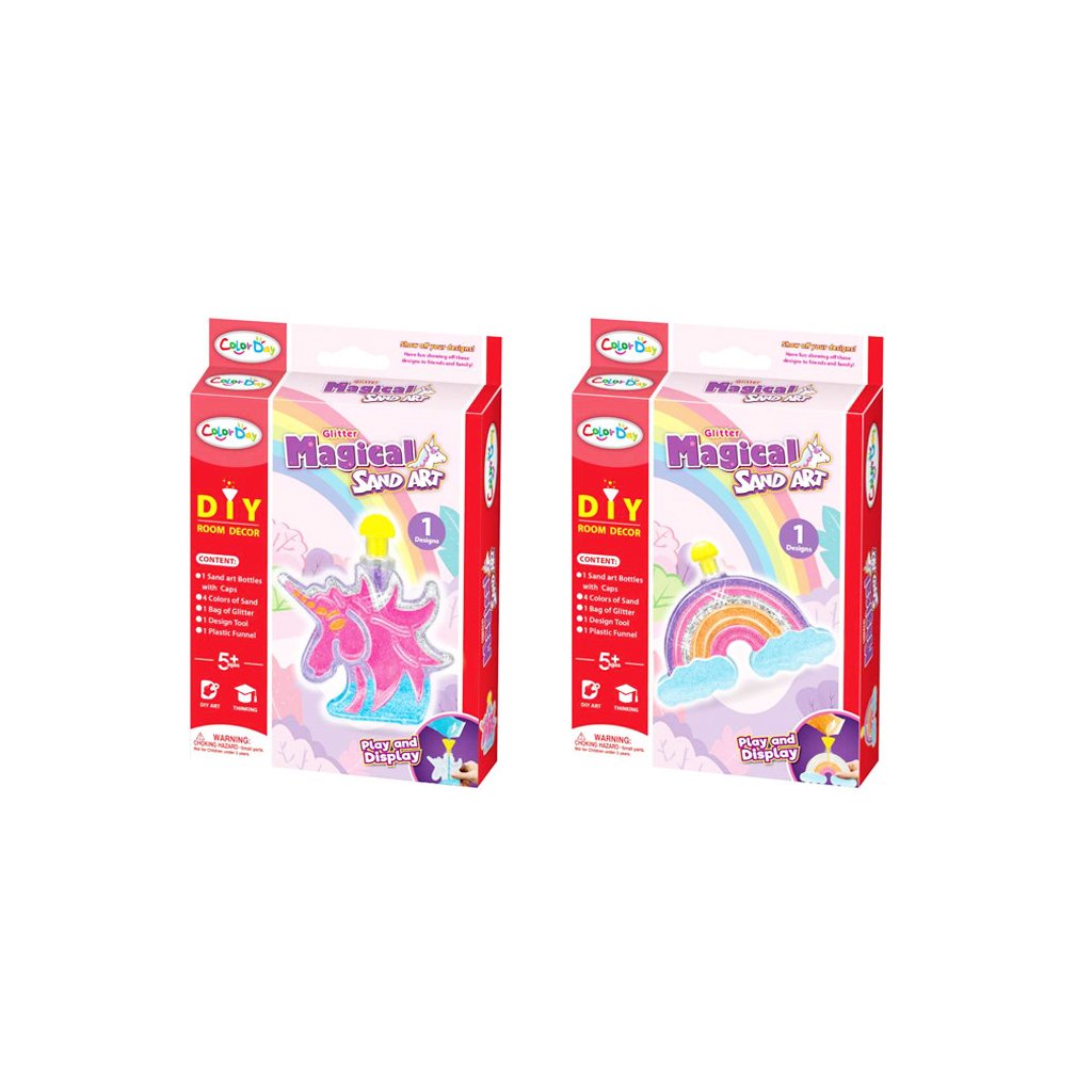 Magický piesok. Na výber z dvoch variánt- dúha a jednorožec. Balenie obsahuje 4 farby piesku, vrecúško s trblietkami, nástroj, lievik a formu.Dodatočné parametre
