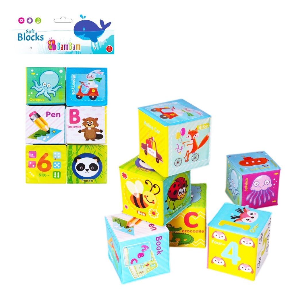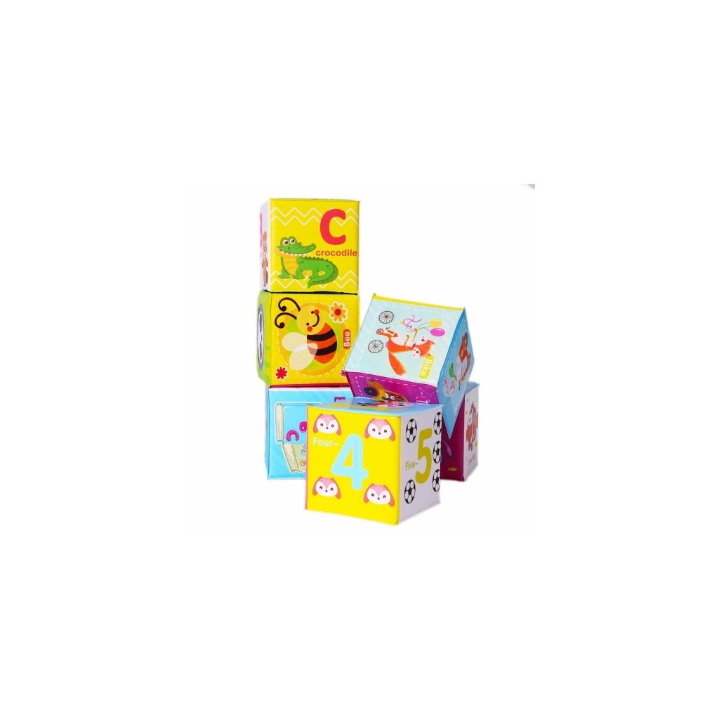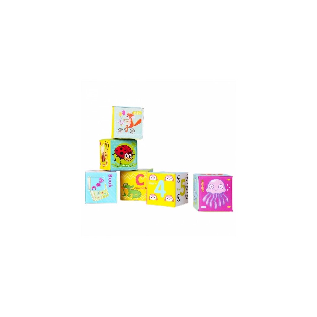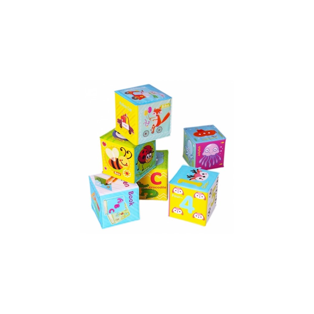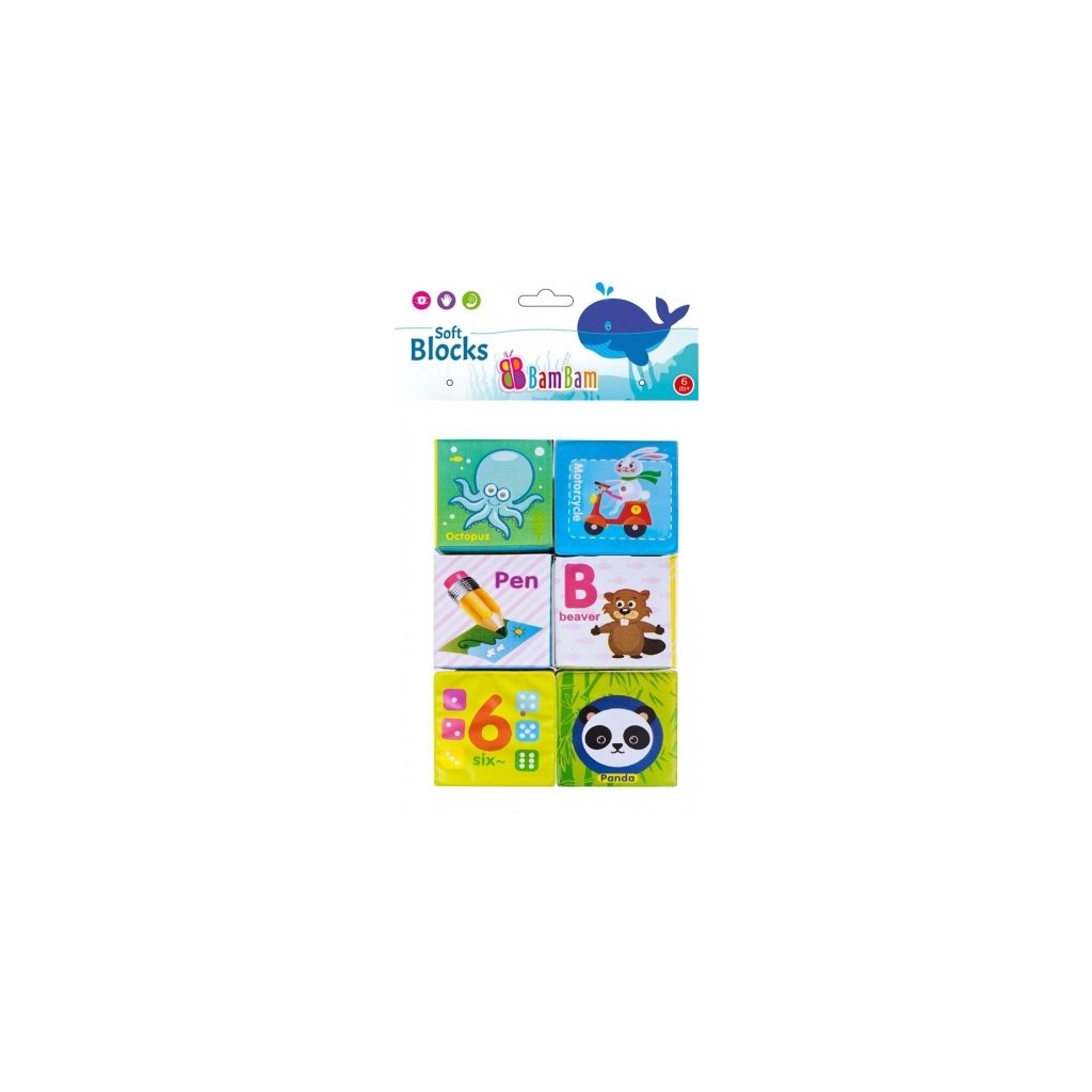 Hračka určená pre deti vo veku 6 mesiacov. Mäkké, vo vnútri naplnené špongiou, v živých farbách vzbudzujú záujem dieťaťa a povzbudzujú prvé učenie hrou. Bloky sú mäkké, veľké, ľahko sa uchopujú, trasú a skladajú, čo ovplyvňuje rozvoj manuálnych a motorických schopností dieťaťa. Ľahké budovanie umožňuje dieťaťu rozvíjať sebadôveru a vieru vo vlastné schopnosti a zároveň učí zásadám reťazca príčin a následkov. Živé farby blokov, vtipných postavičiek, písmen a číslic, ako aj textúra materiálov stimulujú zmysly dieťaťa: zrak, sluch a hmat. Rozmery balenia: [cm]: 15x30x7.Dodatočné parametre