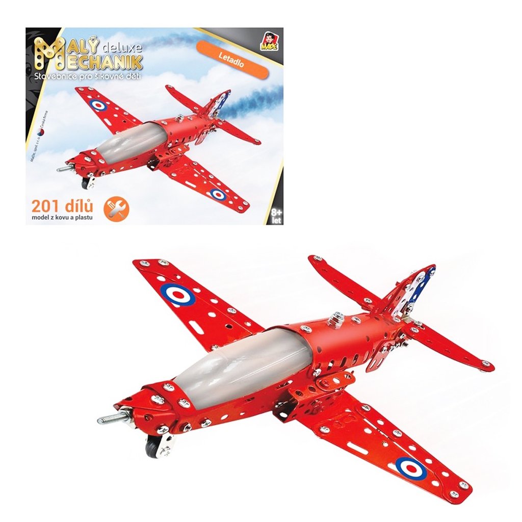 Malý mechanik - lietadlo. Detská stavebnica Malý mechanik obsahuje kovové diely a plastové doplnky, spája sa pomocou skrutiek a matičiek. 201 dielikov. Český box v grafickom dizajne radu Malý mechanik. Rozmer: 25 x 25 x 11 cm. Doporučený vek: 6 +Dodatočné parametre
