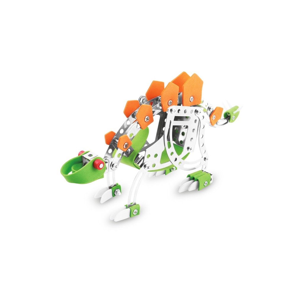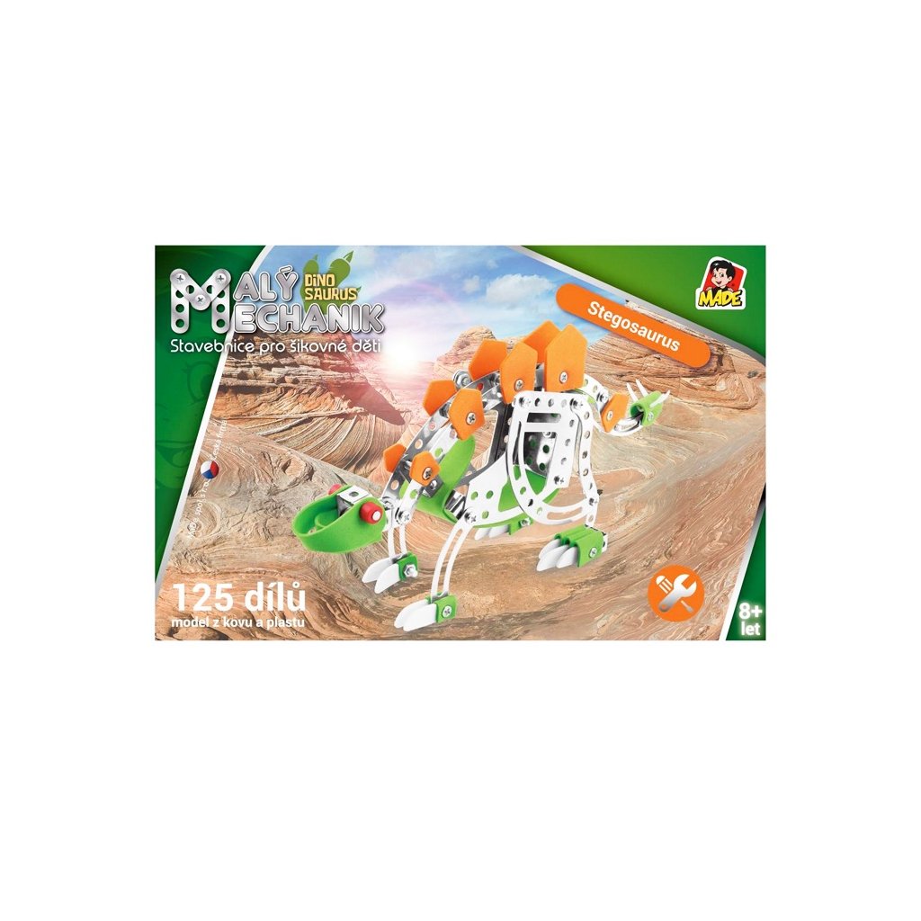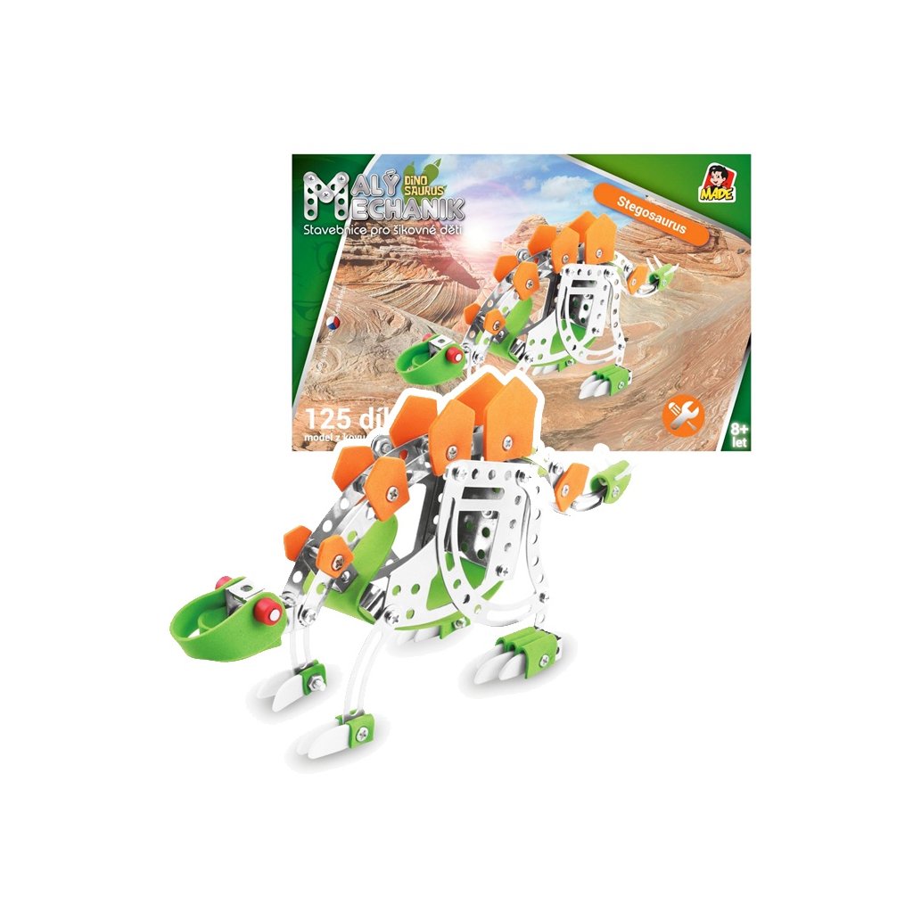 Malý mechanik - stegosaurus. Detská stavebnica Malý mechanik obsahuje kovové diely a plastové doplnky, spája sa pomocou skrutiek a matičiek. 125 dielikov.Český box v grafickom dizajne radu Malý mechanik.