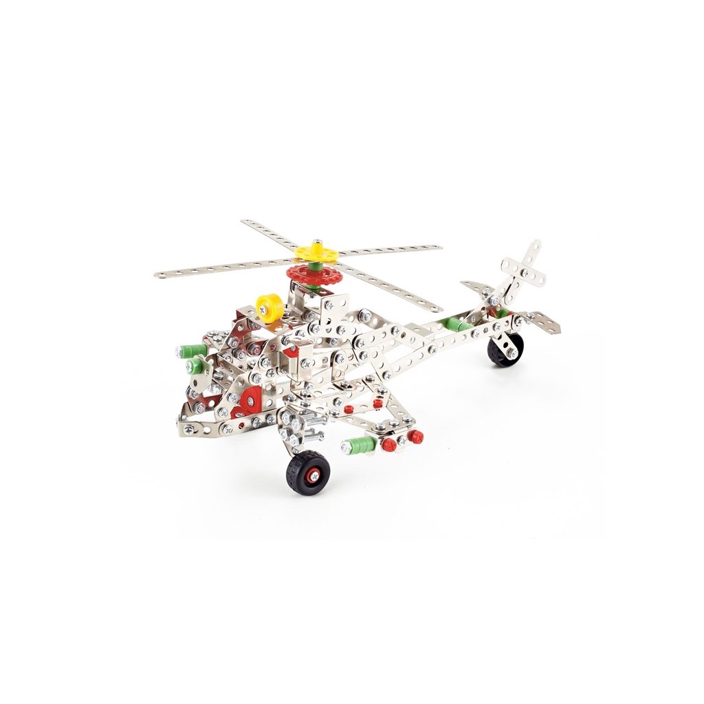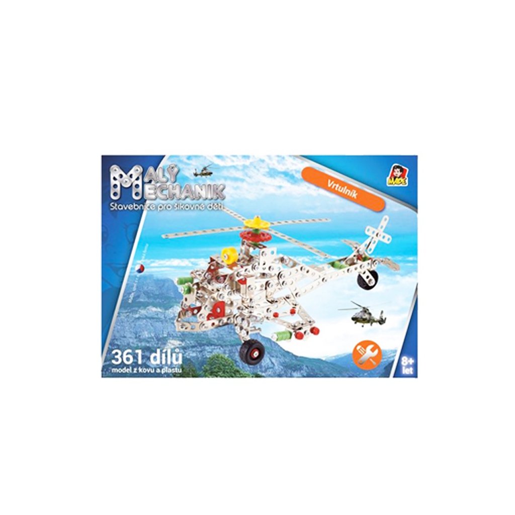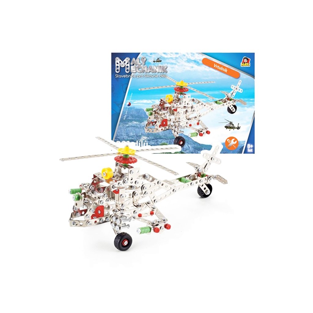 Malý mechanik - vrtuľník. Detská stavebnica Malý mechanik obsahuje kovové diely a plastové doplnky, spája sa pomocou skrutiek a matičiek. 361 dielikov. Stavebnice sú ideálnou voľbou pre všetky deti, rozvíja logické myslenie, jemnú motoriku, sústredenosť a učia trpezlivosti a pritom sú skvelou zábavou.Český box v grafickom dizajne radu Malý mechanik.