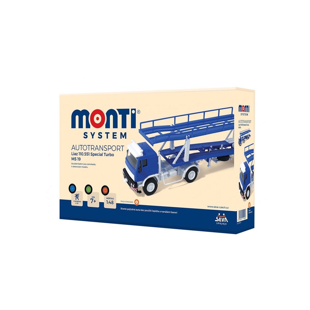 Monti System MS 19 - Autotransport Modely z radu STANDARD sú viac detailnejšie a tým pádom obsahujú viac dielikov. Počet dielikov sa pohybuje približne okolo 50. Aj napriek tomu sú modely radu STANDARD stále jednoduché na zloženie a zvládnu ich zostaviť deti od 6 rokov. Autá sa vyrábajú v mierke 1:48.Dodatočné parametre