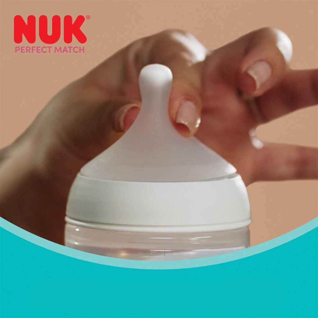 - 3× dojčenská fľaša NUK Perfect Match s patentovaným indikátorom kontroly teploty, jedna fľaša s objemom 150 ml vo veľkosti S (od 0 mesiacov pre materské mlieko), dve fľaše s objemom 260 ml vo veľkosti M (od 3 mesiacov pre umelé dojčenské mlieko), možno kombinovať so všetkými