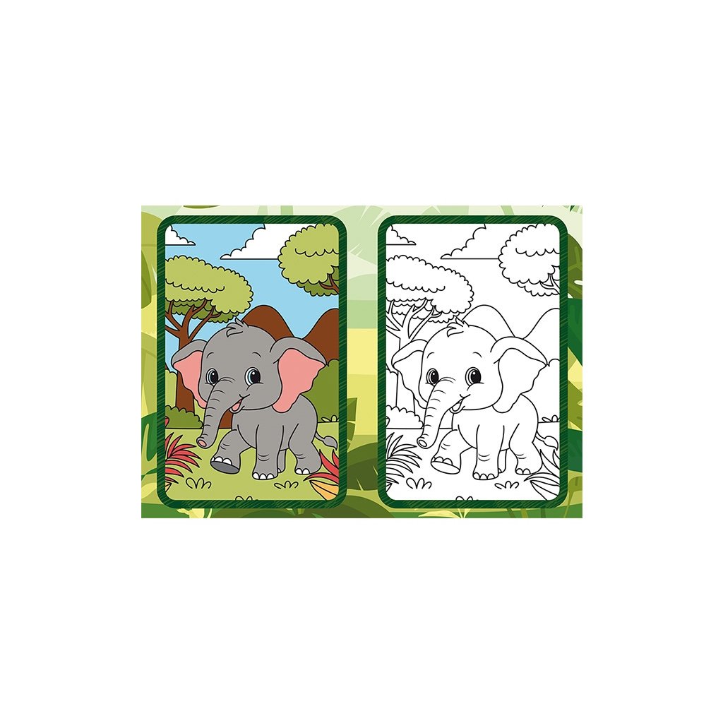 Omaľovánka A5 Zoo. Omaľovánka obsahuje 9 čiernobielych obrázkov na vyfarbenie a 9 farebných predlôh.Dodatočné parametre