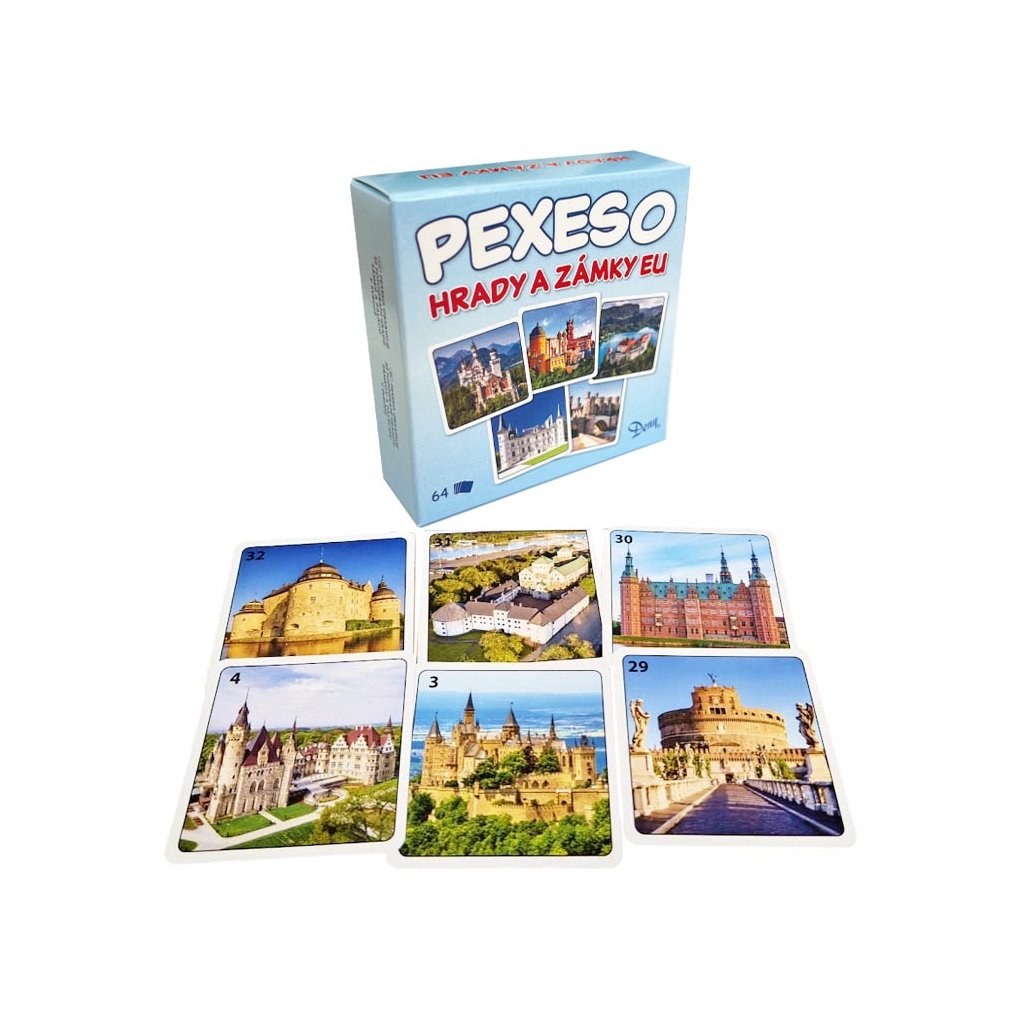 Pexeso Hrady a Zámky Európy je určená predovšetkým deťom, ale aj starším hráčom s veľmi dobrou pamäťou a postrehom. Pexeso je prakticky nastrihané v cestovnej krabičke. Karty pexesa sú nádherne ilustrované a majú rozmer karty až 6,5cm. Balenie obsahuje 64kariet, 32 dvojíc.Dodatočné parametre