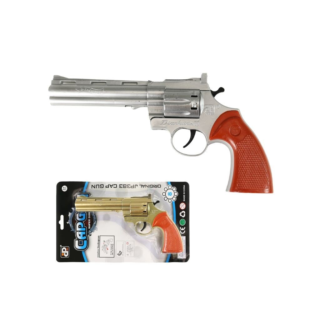 Plastová pištoľ na kapsule je ideálna pre deti, ktoré sa rady hrajú na kovbojov, policajtov alebo akčné dobrodružstvá. Pištoľ je určená na kapsule pre 8 rán a pri hre vytvára realistický zvukový efekt, ktorý dodáva hre väčšiu atmosféru. Kapsule nie sú súčasťou balenia. Produkt je dostupný v zlatom a v striebornom prevedení. Cena je uvedená za jeden kus.Dodatočné parametre