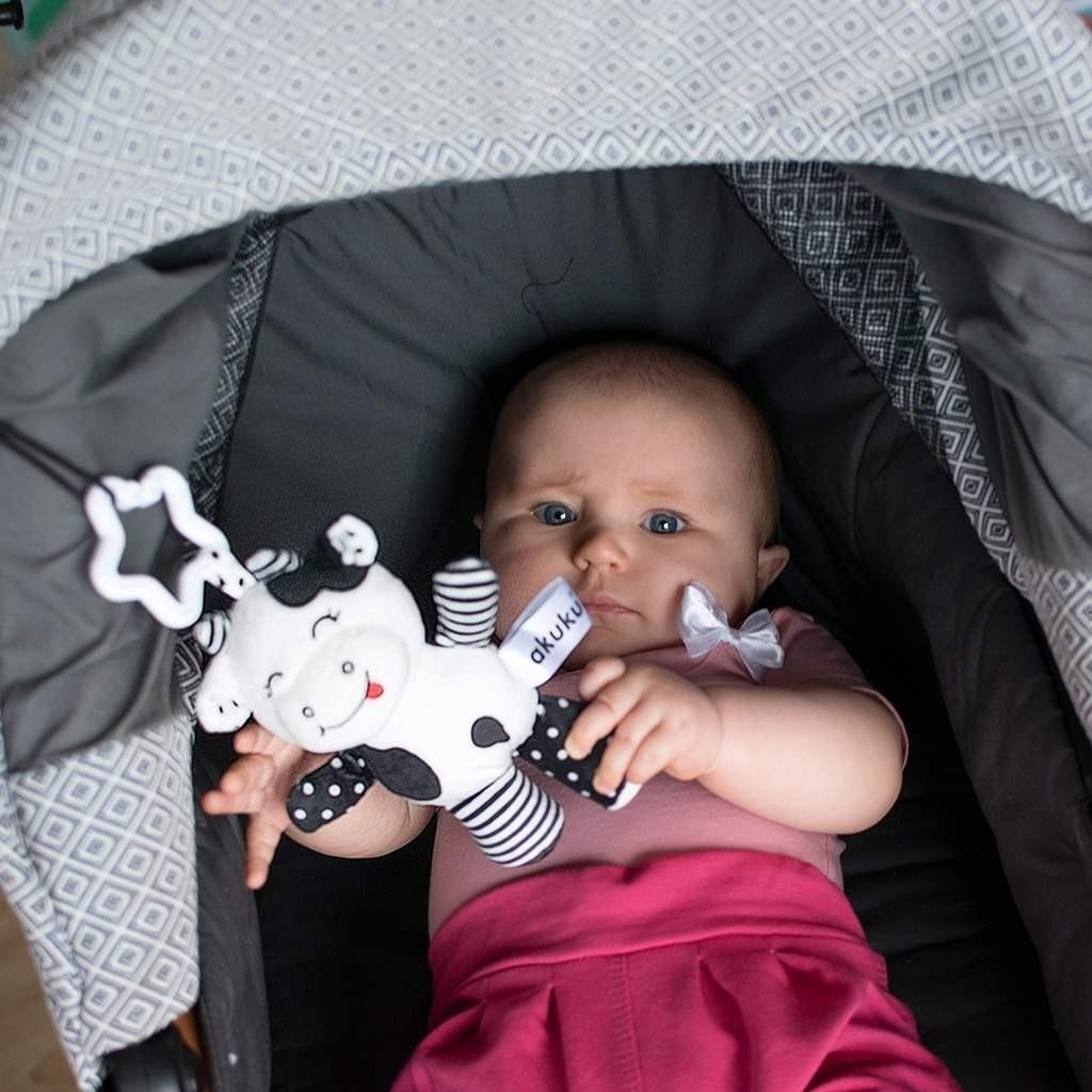 Plyšová hračka s hrkálkou Akuku Kravička čiernobiela