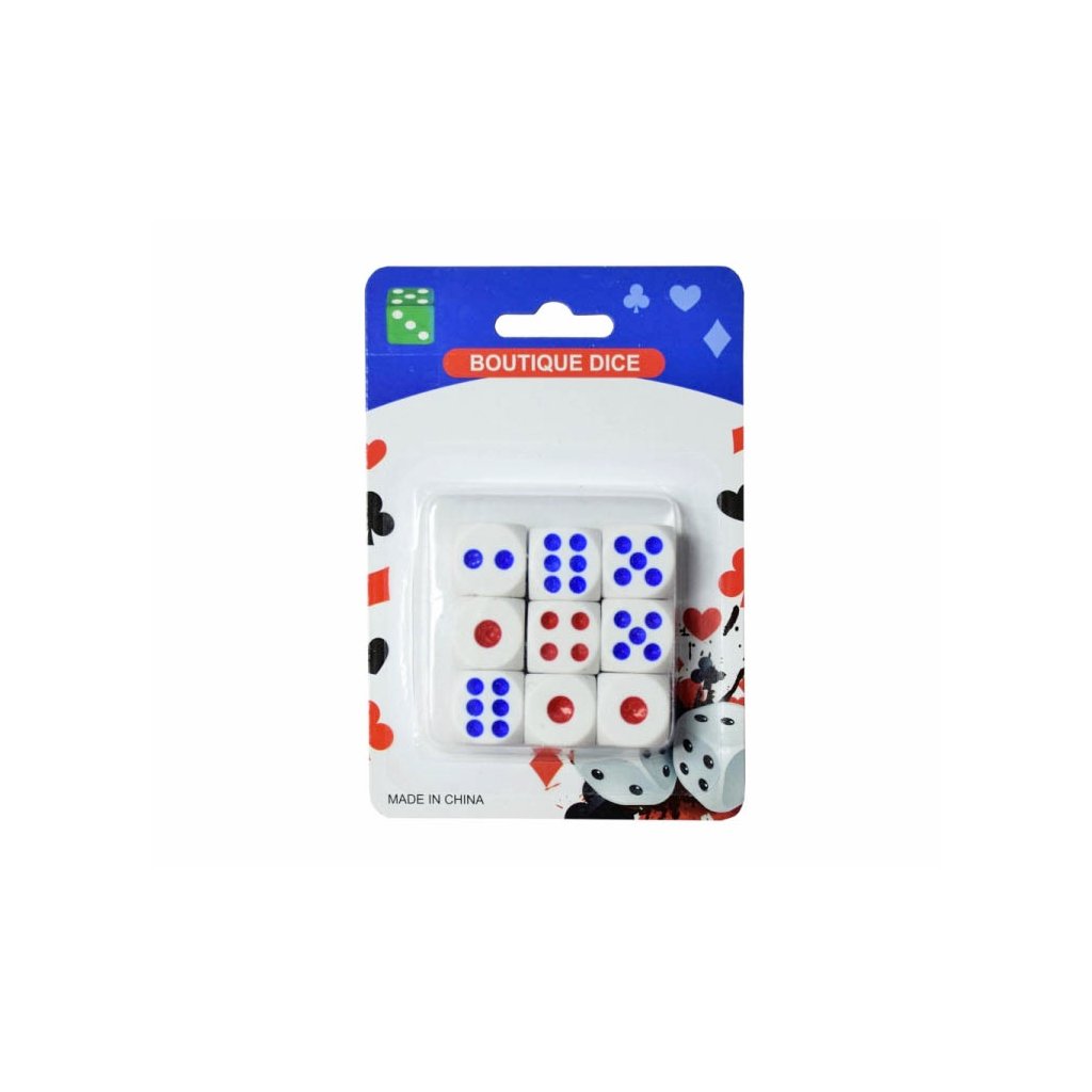 Kocky na stolné hry. Zahraj si kockový poker alebo si odlož ako náhradné k človeče, nehnevaj sa. Balenie obsahuje 9ks kociek. Nevhodné pre deti do 3 rokov.Dodatočné parametre