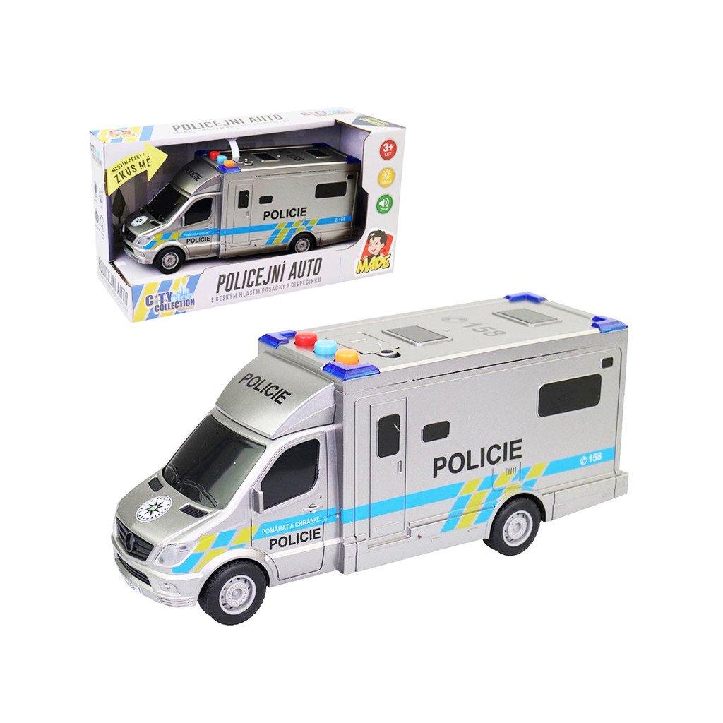 Policajné auto so svetlom a zvukom, rozmer auta je 19,5 cm. Cena je za kus. Vozidlo jazdí na zotrvačník, je vybavené funkčným majákom s výstražnými svetlami a hlasom posádky vozidla a dispečingu, má otváracie dvere. Na sprevádzkovanie produktu sú potrebné 3 AG13 batérie. Batérie sú súčasťou balenia. Vhodné pre deti vo veku 3+Dodatočné parametre