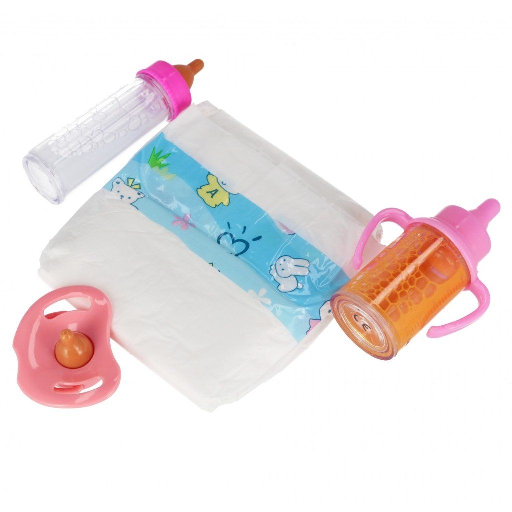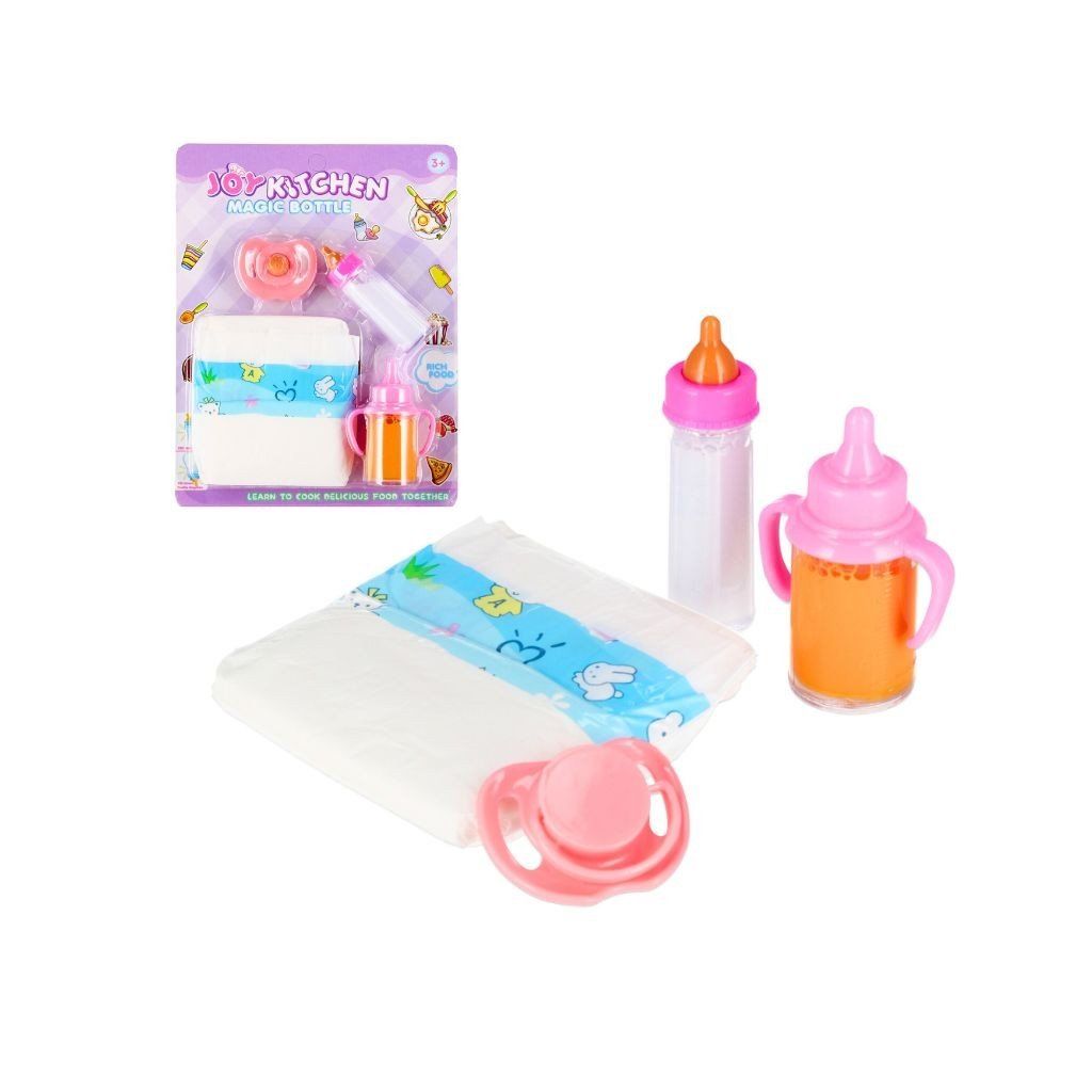 Detská sada doplnkov pre bábiku bábätko – fľaštičky, plienka a cumlík umožnia deťom starať sa o svoju bábiku ako o skutočné dieťatko. Rozvíja empatiu, starostlivosť a predstavivosť. Určené pre deti od 3 rokov. Cena za kus.Dodatočné parametre