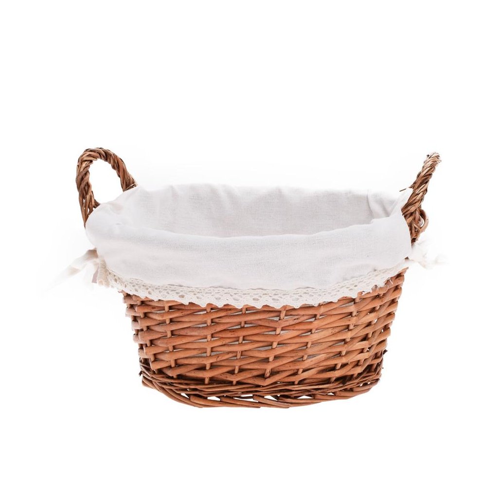 Cena za 1 ks: 4.1, PRÚT. KOŠÍK OVÁL HNEDÝ S RÚČKOU BIELA LÁTKA 29x23x15CMDodatočné parametre