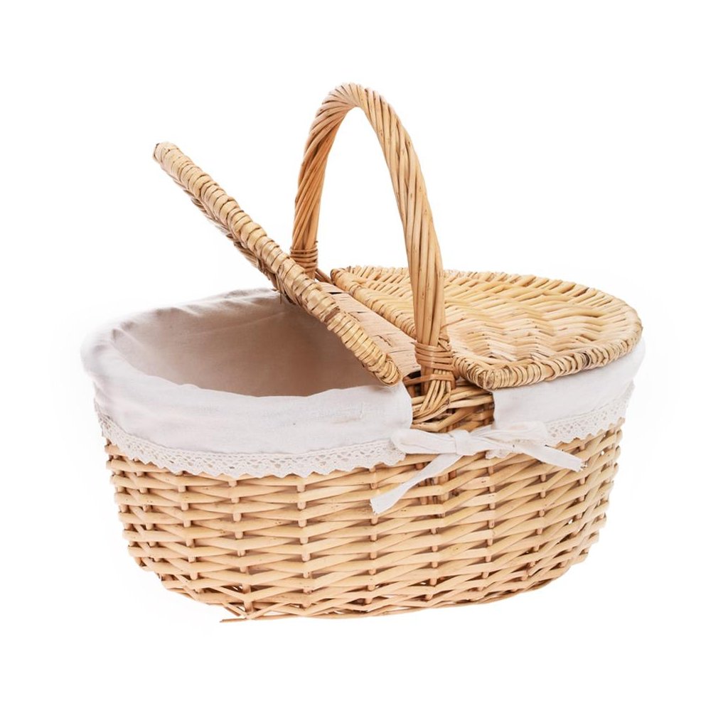 Cena za 1 ks: 22.55, PRÚT. PIKNIKOVÝ KOŠÍK OVÁL SV. HNEDÁ S RÚČKOU BIELA LÁTKA 46x36x21x42CMDodatočné parametre
