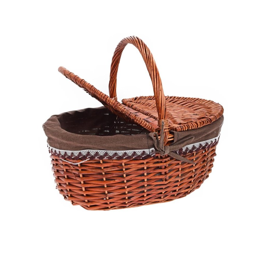 PRÚT. PIKNIKOVÝ KOŠÍK OVÁL TM. HNEDÁ S RÚČKOU TM.HNEDÁ LÁTKA 38x28x17x36CM