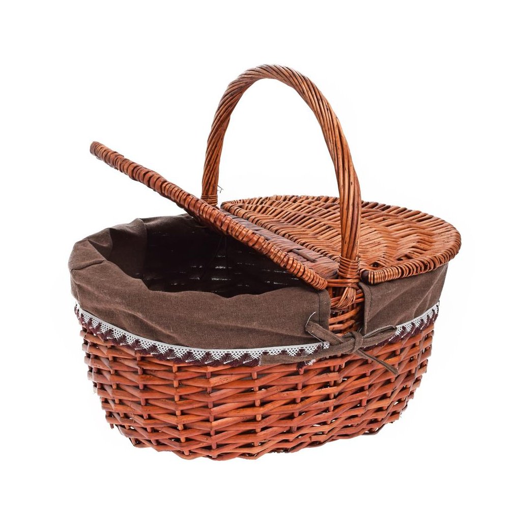 PRÚT. PIKNIKOVÝ KOŠÍK OVÁL TM. HNEDÁ S RÚČKOU TM.HNEDÁ LÁTKA 46x36x21x42CM