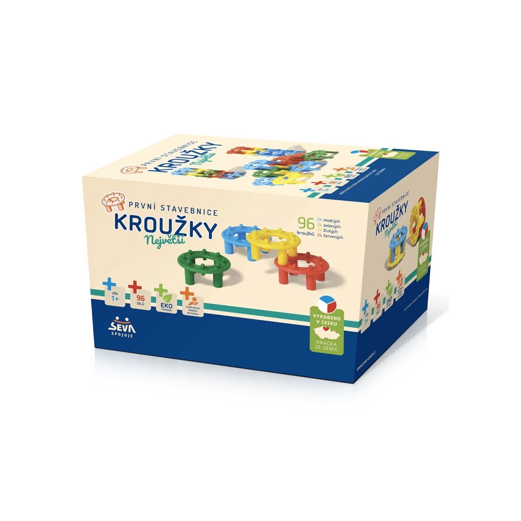 Prvá stavebnica KRÚŽKY obsahuje 96 dielov. je určená pre tie najmenšie deti. Obsahuje 96 dielikov v 4 farbách. So stavebnicou sa môžu hrať deti od 1 roku. Pomáha im precvičovať cit v prstíkoch a spoznávať základné farby. Všetky stavebnice KRÚŽKY sú vzájomne plne kompatibilné, takže ju môžete neustále rozširovať a dopĺňať o nové dieliky.Dodatočné parametre