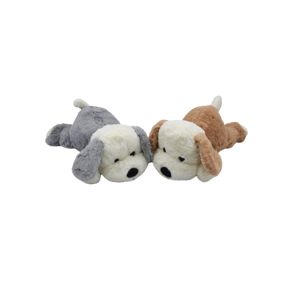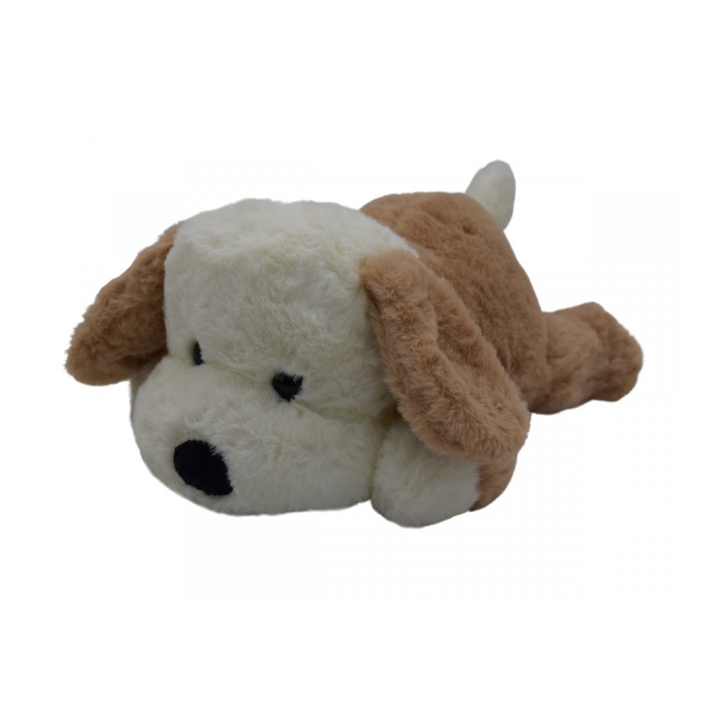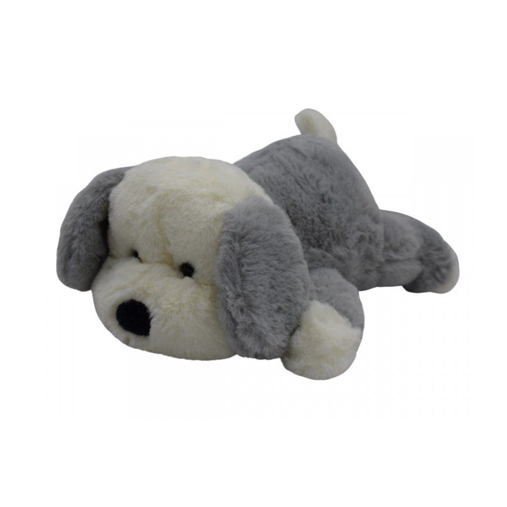 Jemný ležiaci 26cm psík Pinko. Možnosť výberu z dvoch farieb - sivý alebo hnedý.