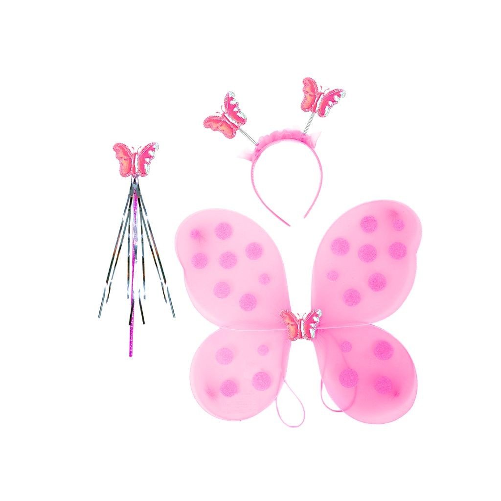 Roztomilé ružové motýlie krídelká na gumičku sú určené pre dievčatká vo vekovom rozmedzí 3-10 rokov 104-150 cm. Súčasťou tejto karnevalovej sady je tiež čelenka s motýlikmi na pružinkách a palička.Dodatočné parametre